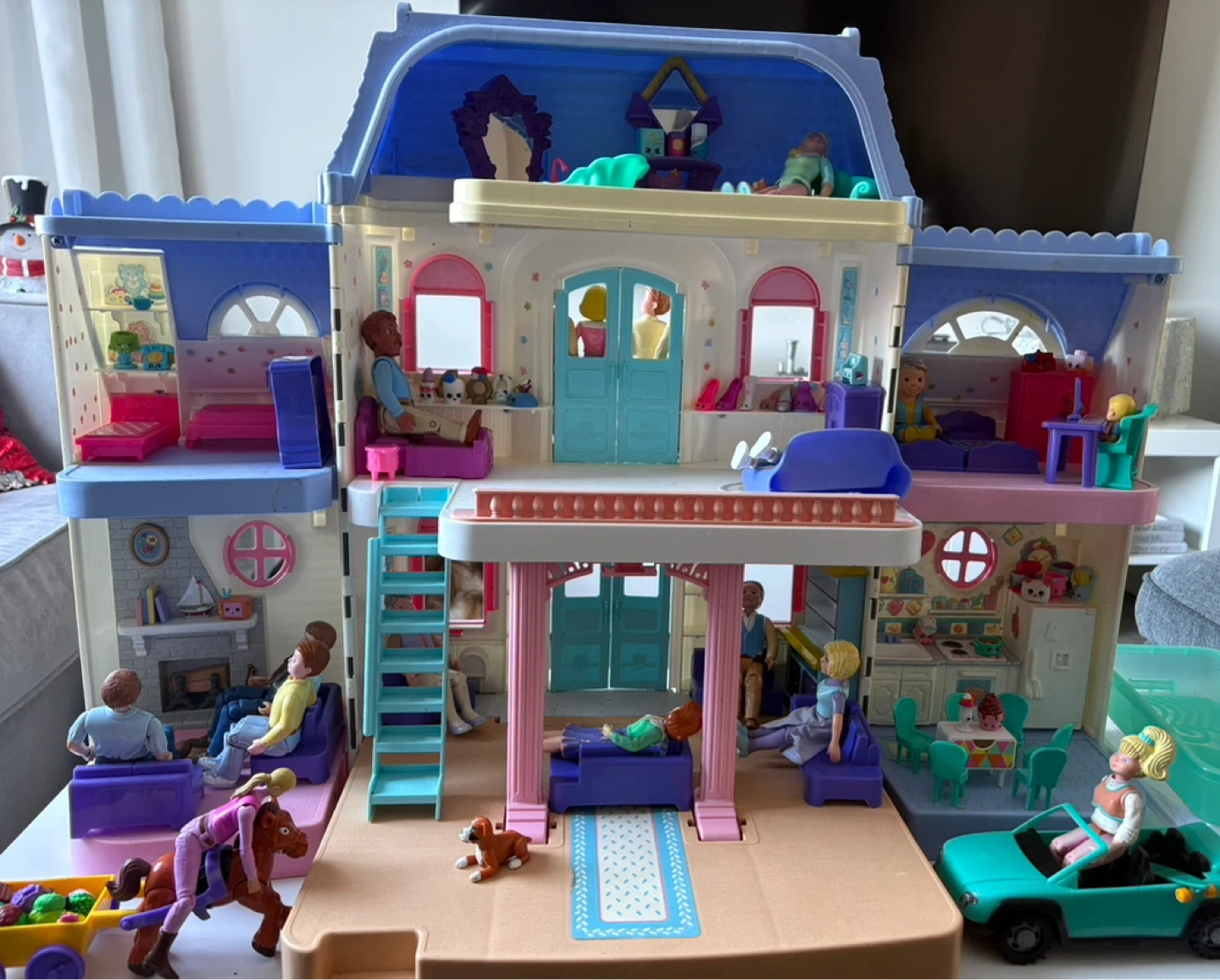 Fisher Price Loving Family Dollhouse in great condition! It's a charming playset for kids to create their own family stories. Comes with many extras including some shopkins and 17 people. Everything is fisher price except the furniture and the car.