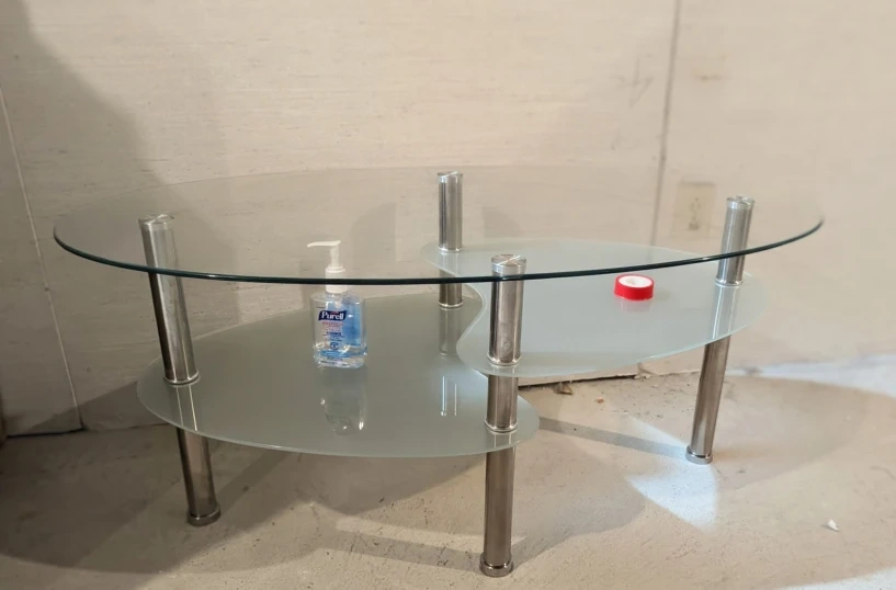 Selling a unique glass coffee table! It has a modern design with a clear glass top and a frosted glass shelf below. The legs are a sleek silver colour. It's a great piece to add some style to your living room
