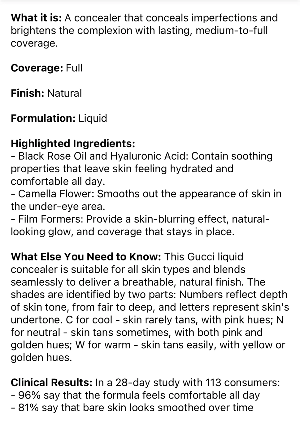 Gucci Concentré de Beauté Multi-Use Crease Proof and Hydrating Concealer in shade 25N. It's a fair medium with neutral undertones and a natural finish. This concealer is suitable for all skin types and blends seamlessly to deliver a breathable, natural finish. The shade numbers reflect depth of skin tone, from fair to deep, and letters represent skin's undertone.