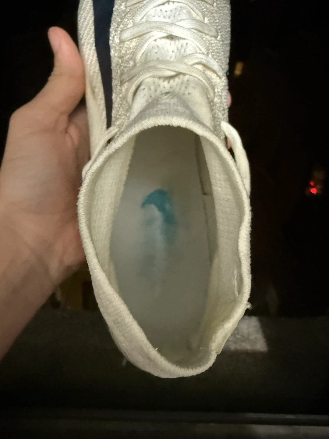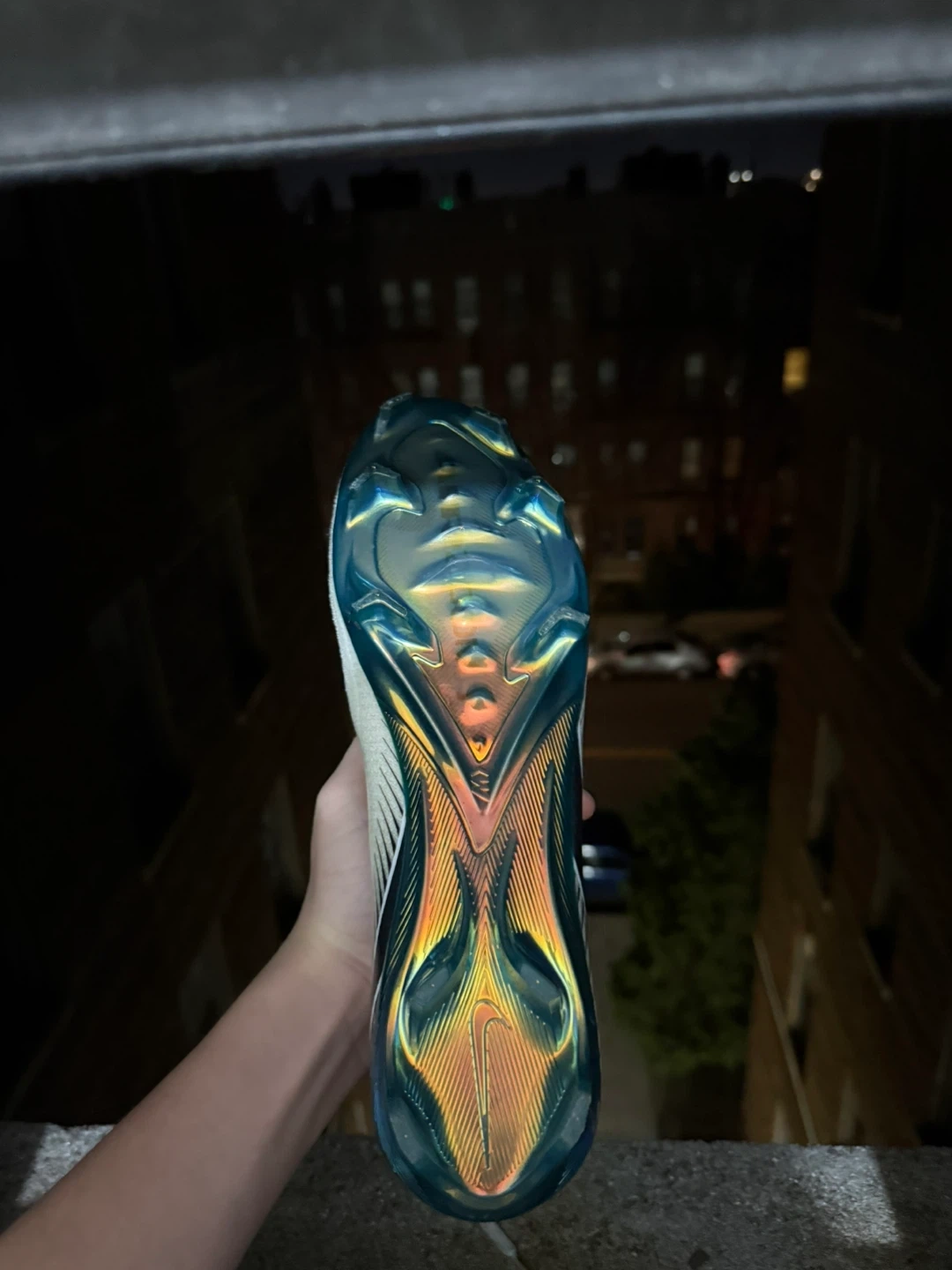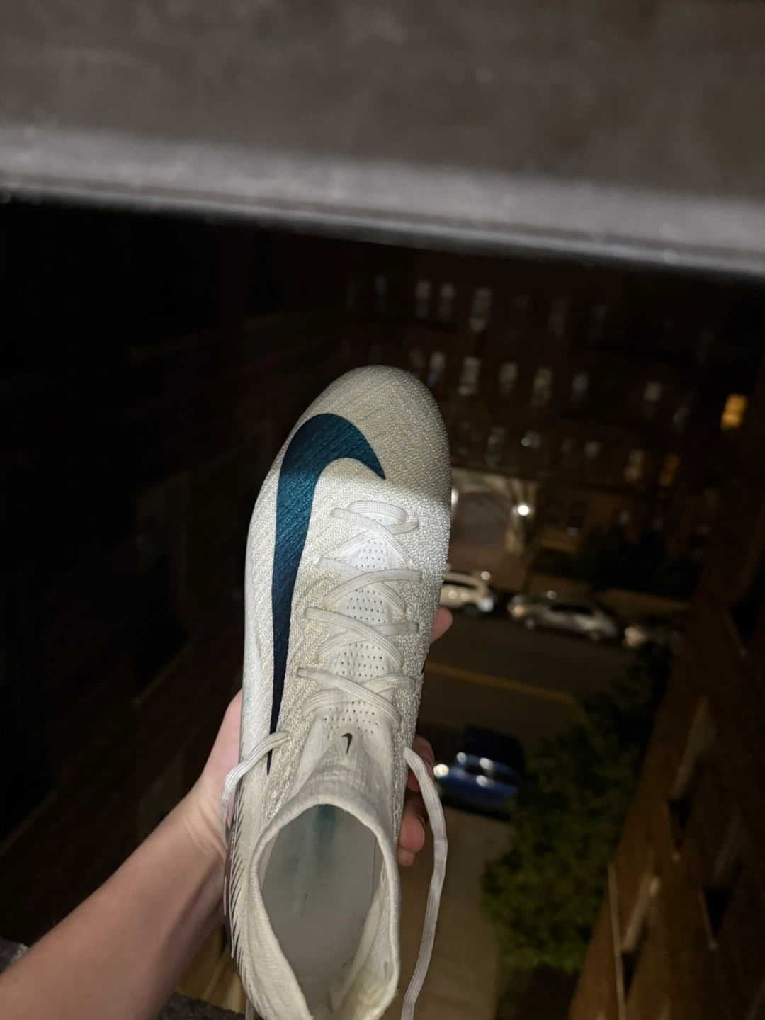 Selling a pair of Nike Mercurial Air Zoom soccer cleats. They are white with a blue swoosh. Great for playing soccer!