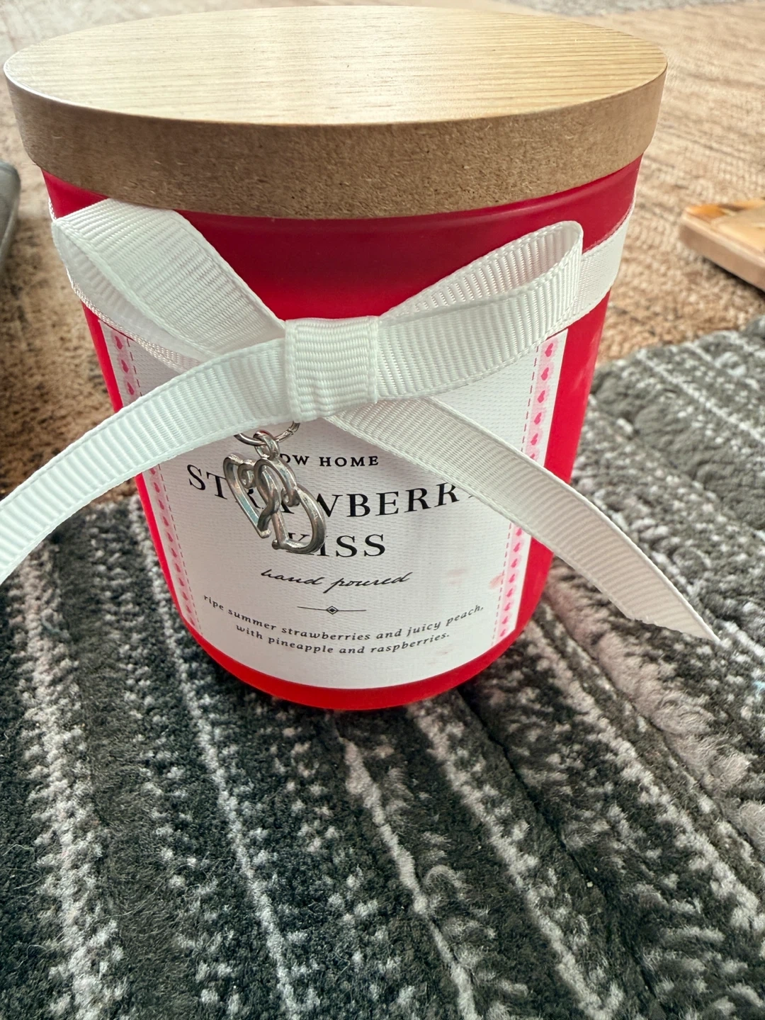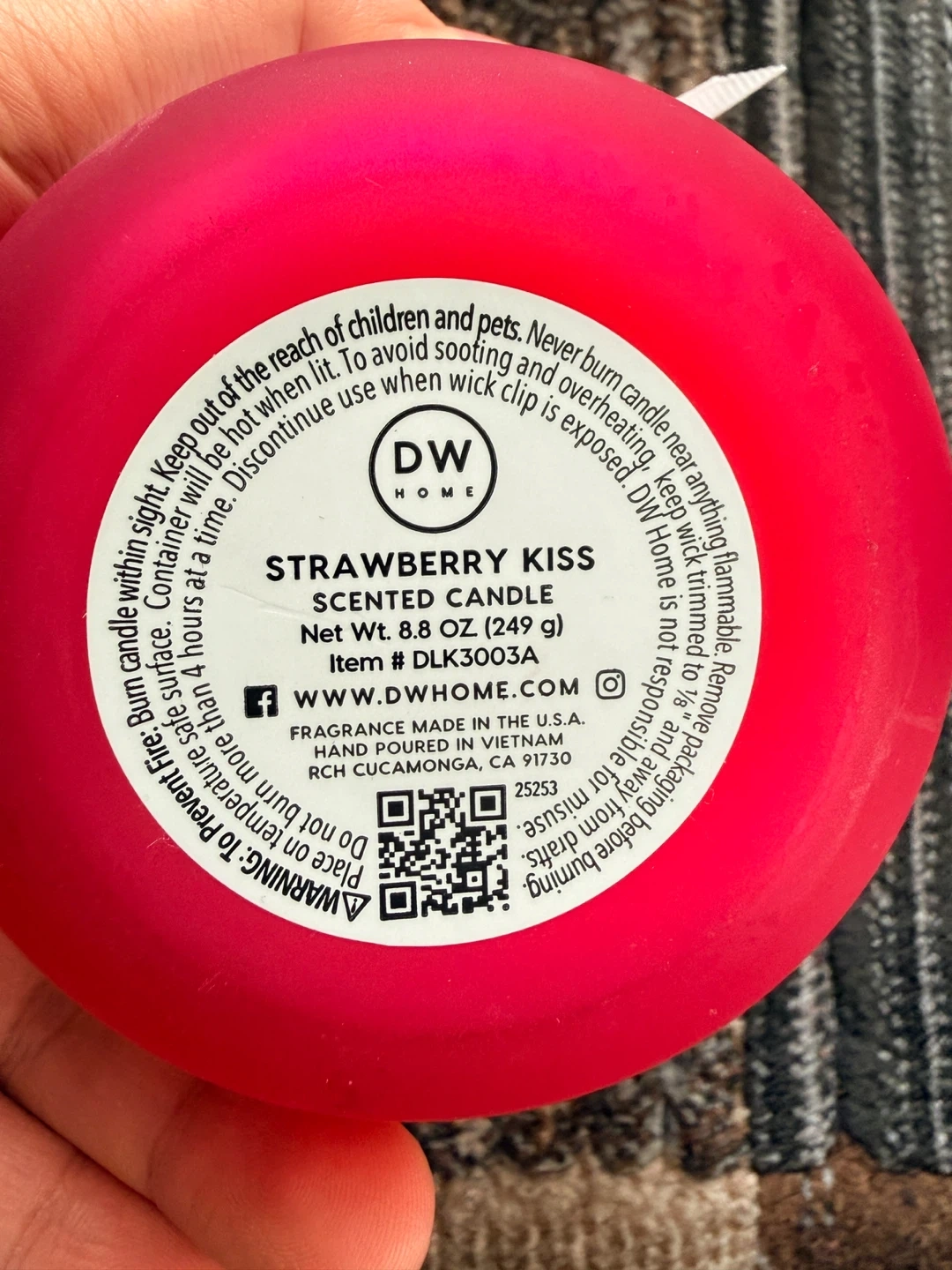 Selling a DW Home Strawberry Kiss scented candle! It's hand poured, with ripe summer strawberries and juicy peach, with pineapple and raspberries. Net weight is 8.8 oz (249 g).