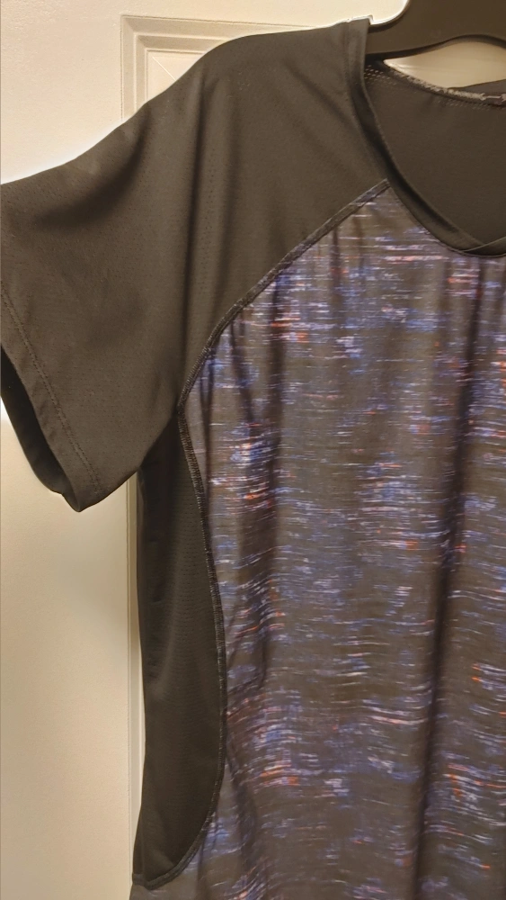 Here's a 34 Degrees Cardio Training shirt. It's black with a cool abstract pattern on the front and back. Perfect for your next workout!