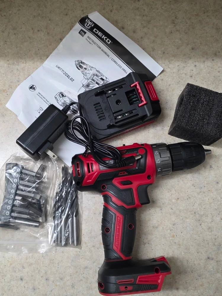 Selling a DEKO cordless drill, model DKCD20XL02. It's in excellent comes with the box and all original components. This drill is designed for drilling and driving screws into wood, plastic, ceramic, and metal. It has a maximum torque of 40N.m and an 18+1 torque control to help adjust the torque. It also features a gear switch for changing between higher and lower speeds. Great for both professional contractors and DIY enthusiasts!