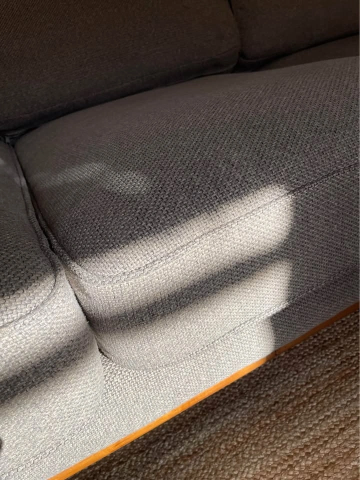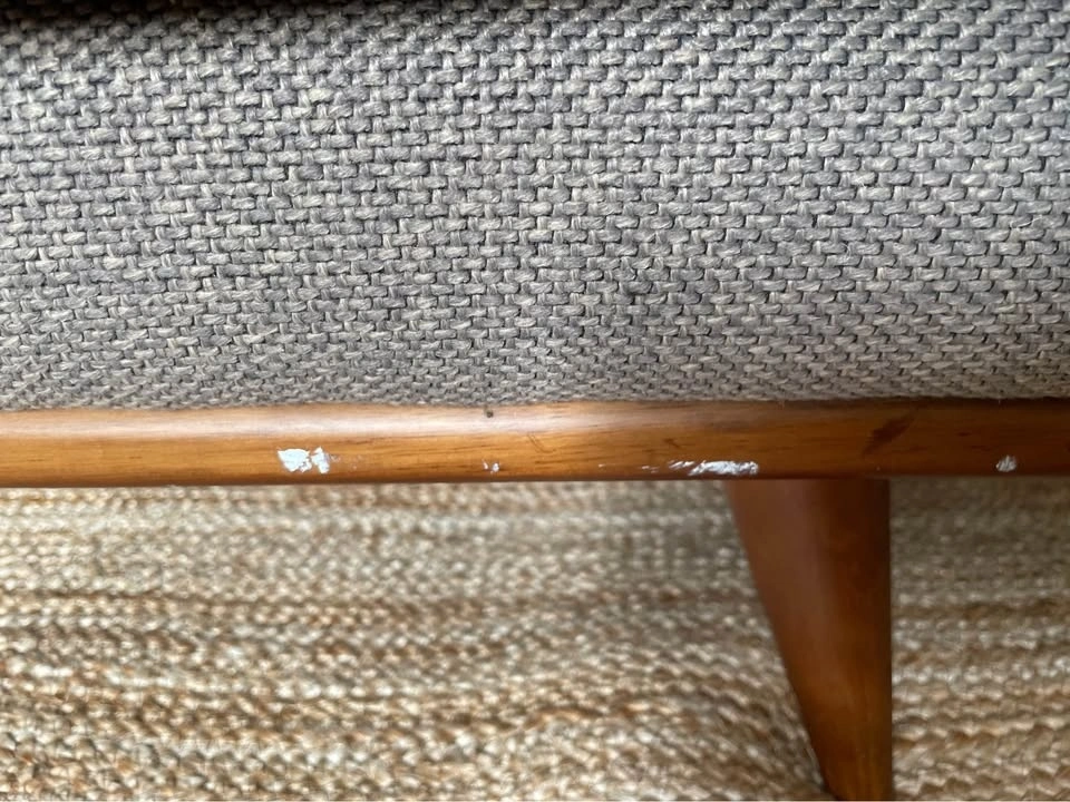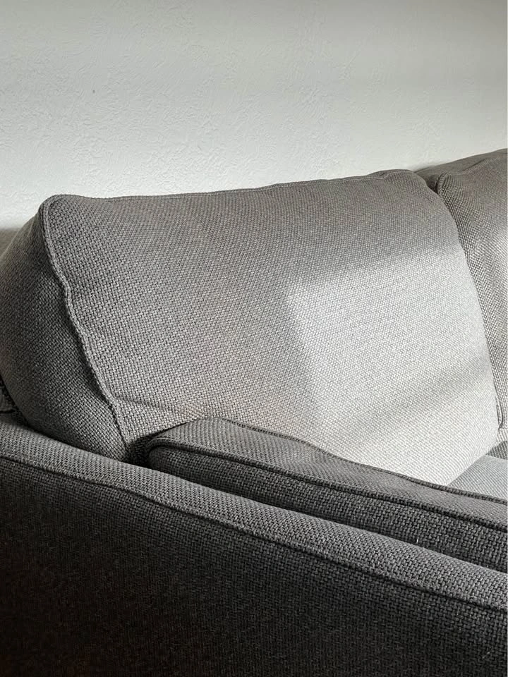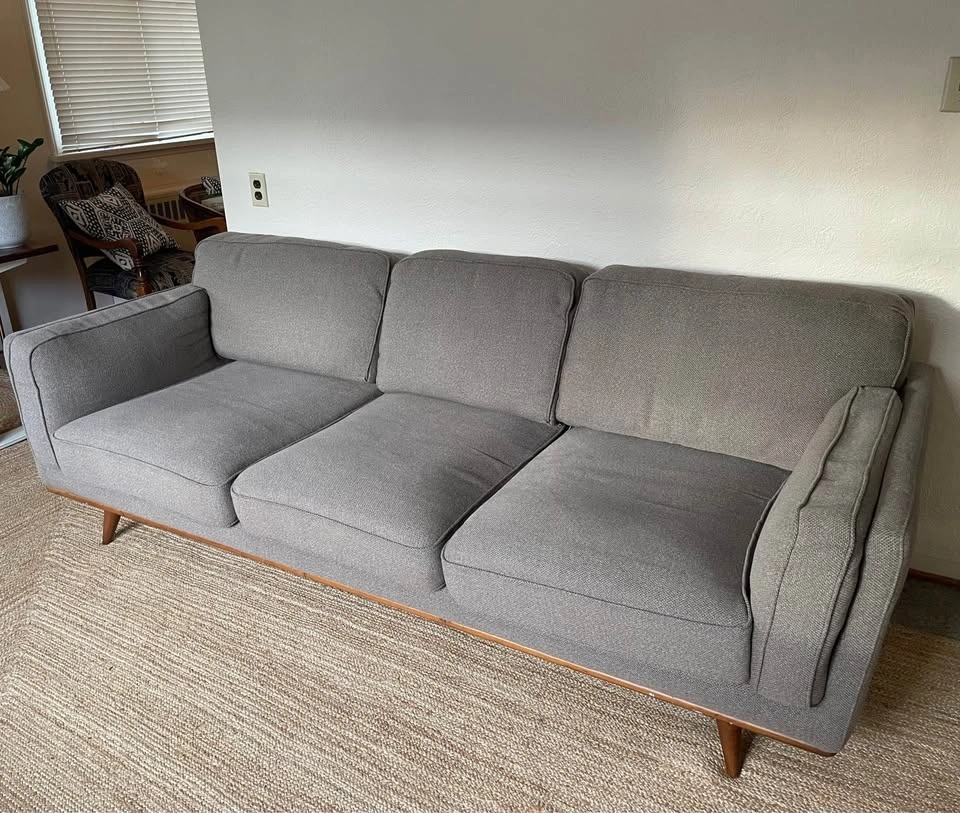 Comfy couch in very good condition from a non-smoking/pet-free household. Fabric and cushions in great condition, a few minor scrapes/paint marks (probably easily removed) on the wood trim from moving. Colour is slightly more brown (shows more grey in photos).