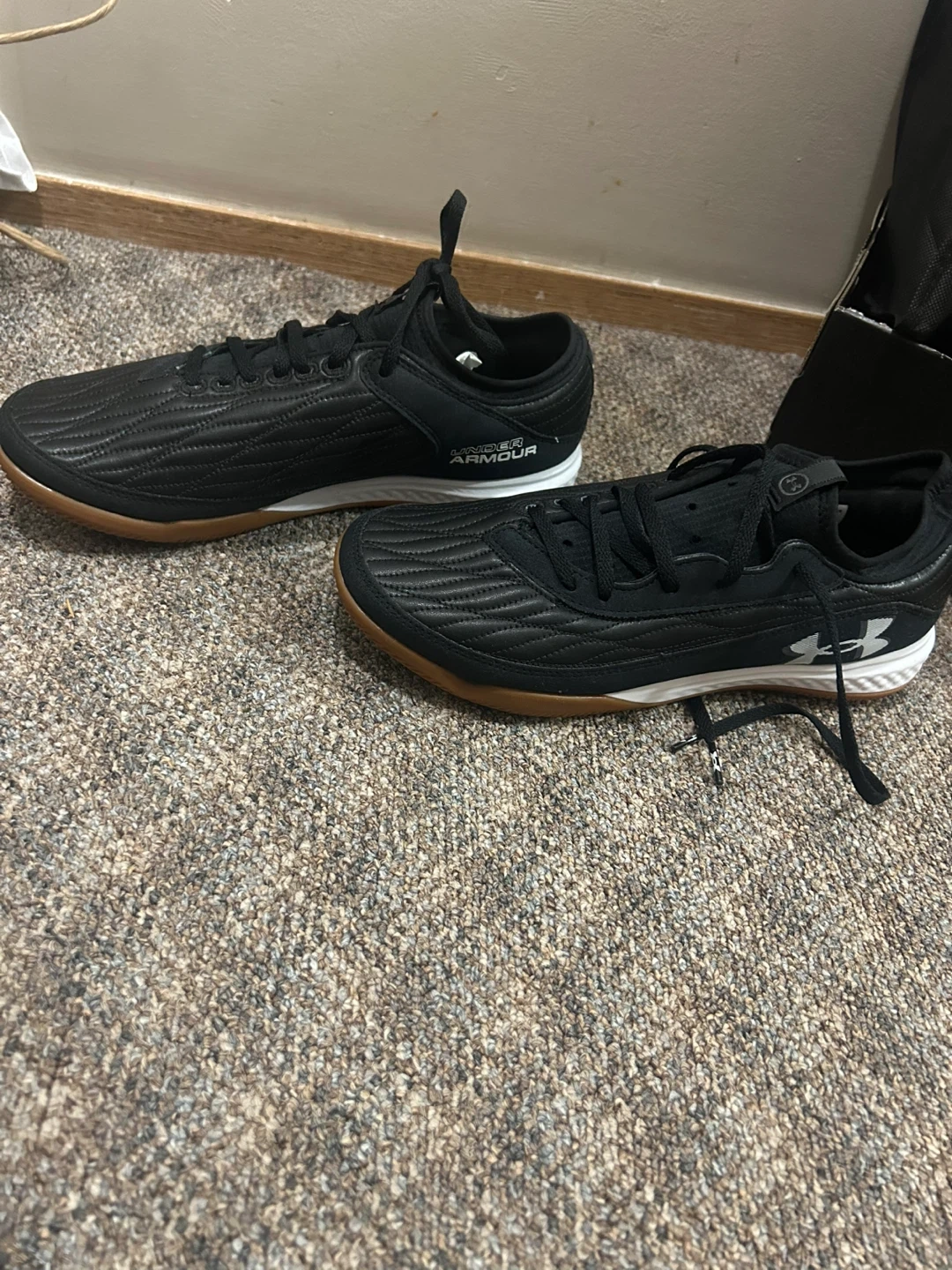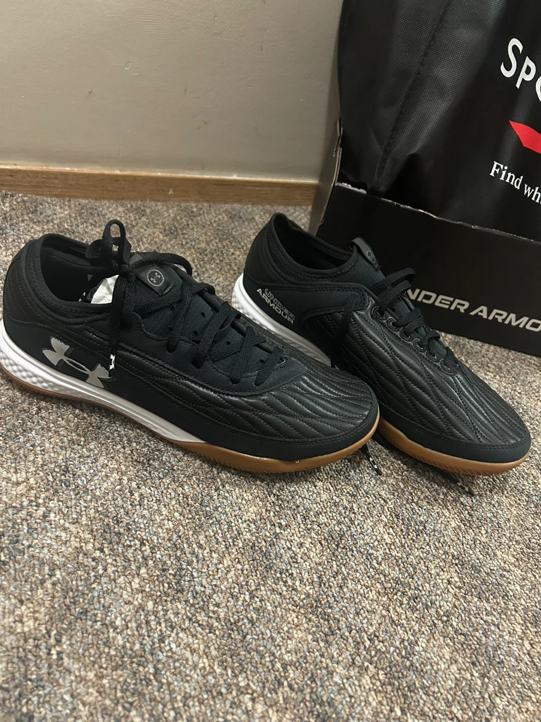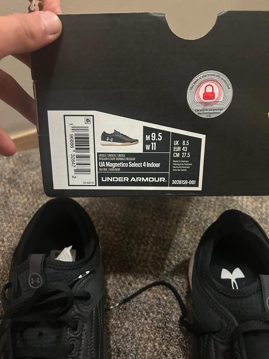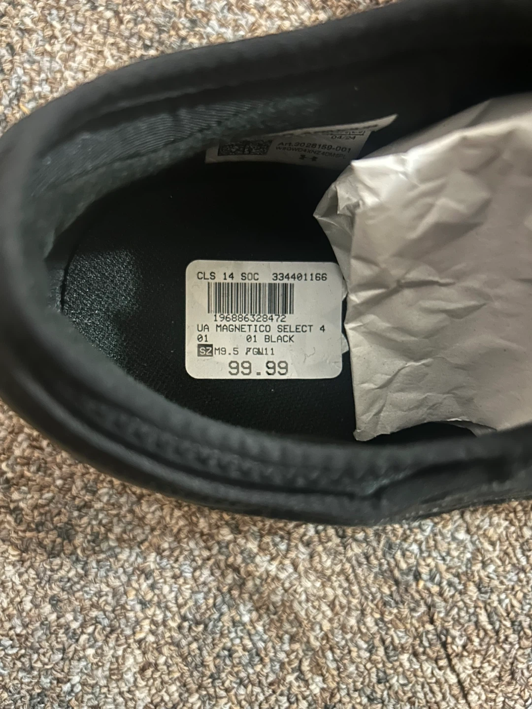 Selling a pair of Under Armour Magnetico Select 4 Indoor shoes in black. They are a size 9.5 (US). The original price was $74.97. They come with the box too!