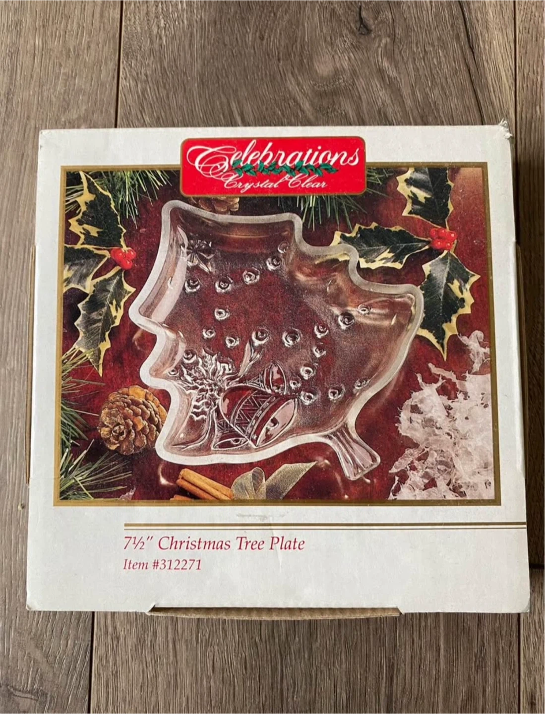 Selling a Celebrations Crystal Clear 7.5" Christmas Tree Plate! It's a cute plate shaped like a Christmas tree, perfect for holiday treats or decorations. The plate is new and comes with its original box