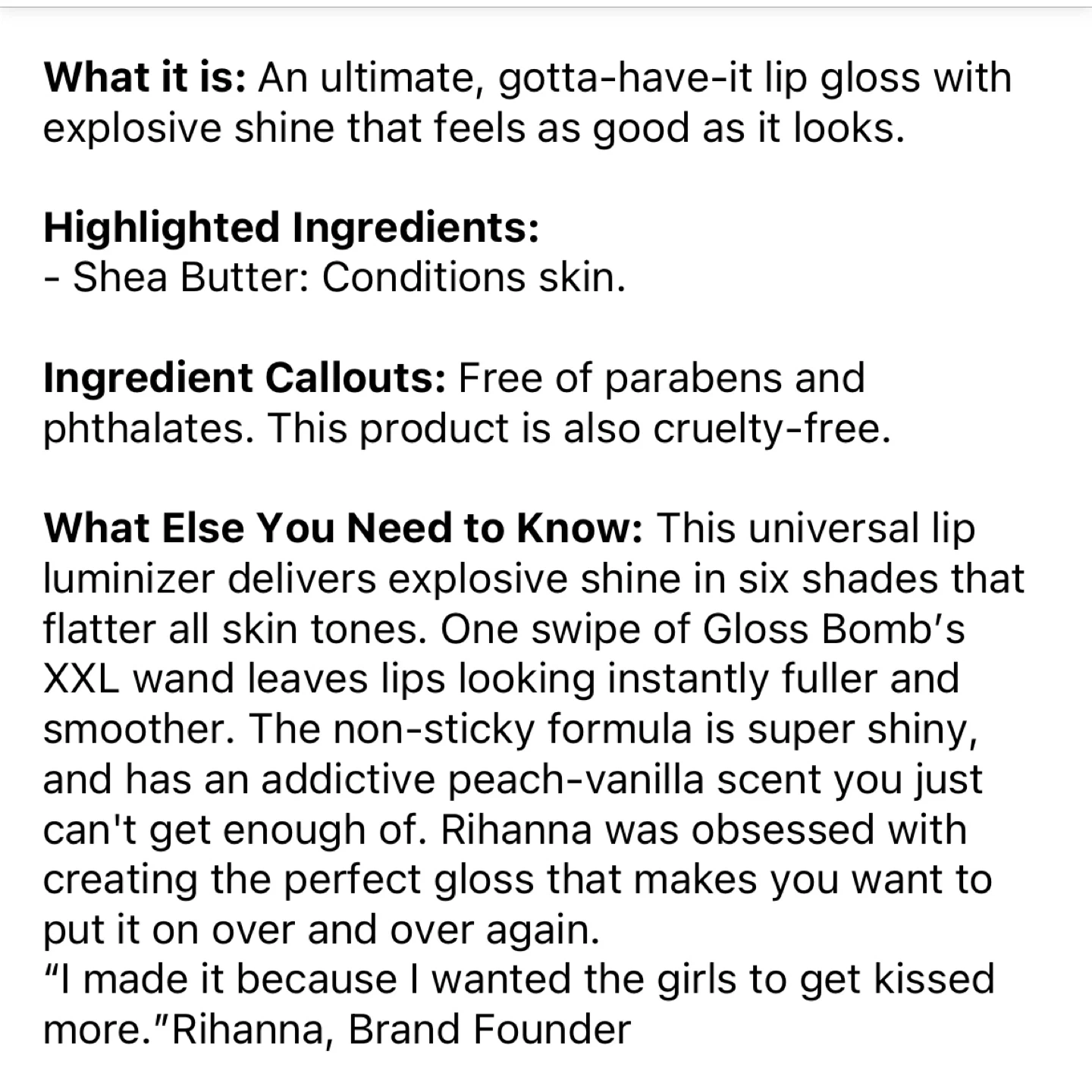Lip Gloss Mini Set. Fenty Beauty Gloss Bomb Universal Lip Luminizer in the shade Fussy (shimmering pink). It's a gotta-have-it lip gloss with explosive shine that feels as good as it looks. The non-sticky formula is super shiny, and has an addictive peach-vanilla scent. 2ml / 0.07fl oz. Anastasia Beverly Hills lip gloss in the shade Amber Sparkle. Adds a lovely shimmer to your lips. Perfect for adding a touch of sparkle to your look. 3.1 ml / 0.105 fl oz. Both items are brand new - in box.