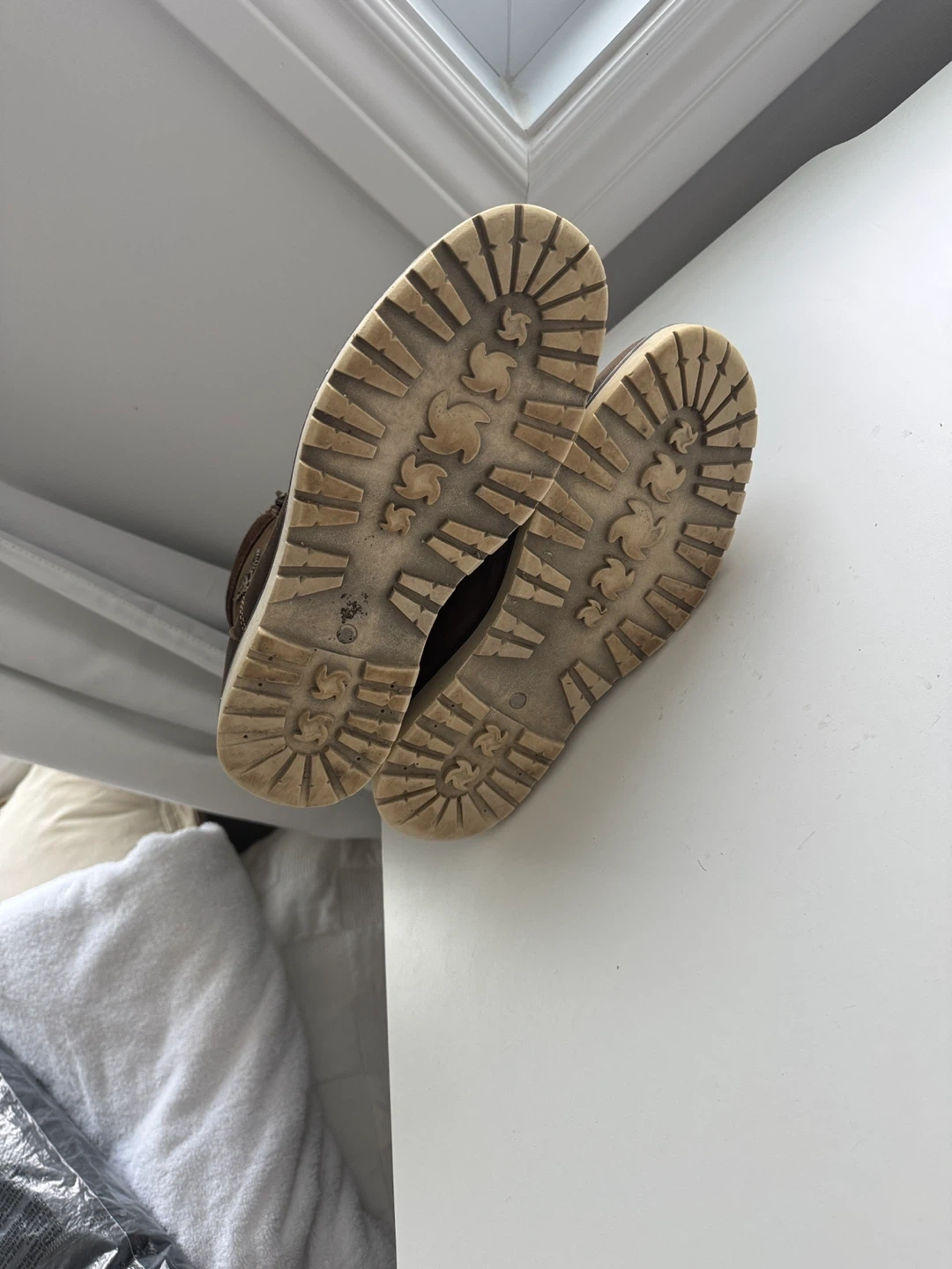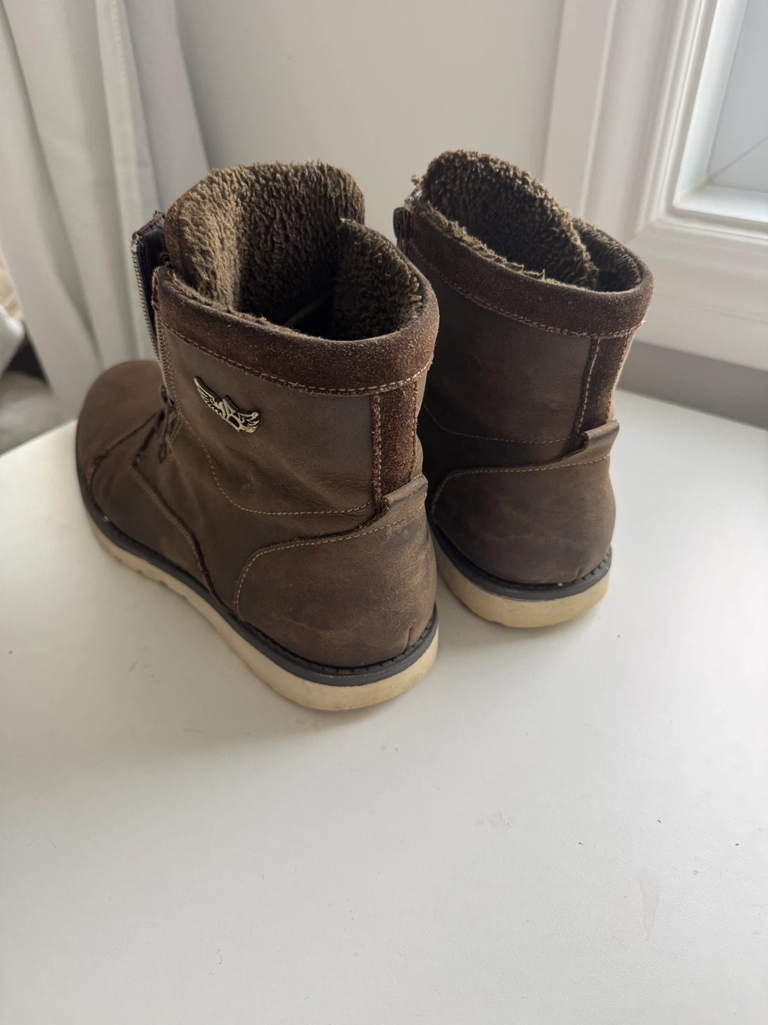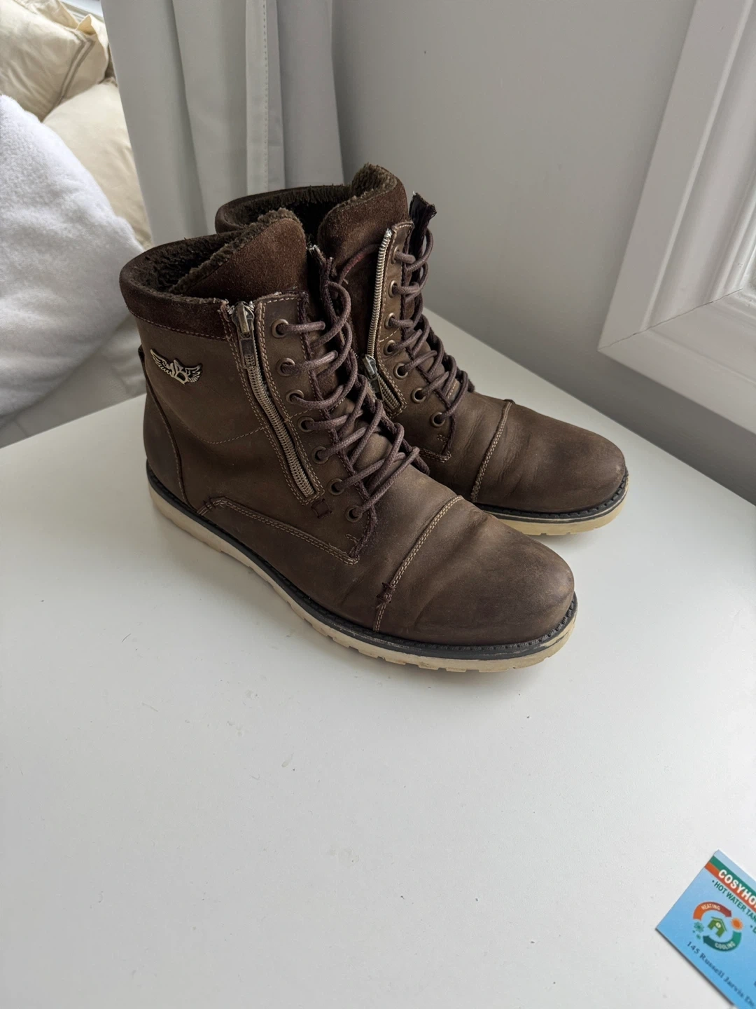 Selling a pair of Steve Madden boots in brown leather. They have a lace-up closure and a zipper on the side. They are in good condition and ready for the winter weather!