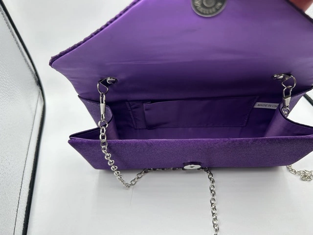 ✨ Stunning Deep Purple Evening Bag / Clutch ✨ Elevate your look for any special occasion with this vibrant and elegant deep purple clutch! Perfect for weddings, proms, galas, formal dinners, or New Year's Eve. Style & Details: Color: Rich Royal Purple Design: Features a beautifully pleated envelope-style flap adorned with scattered, dazzling clear rhinestones/crystals. Material: Shimmery satin or fabric exterior. Carrying Options: Comes with a detachable, long silver-tone chain strap so it can be worn as a shoulder bag, crossbody, or carried as a classic clutch. Closure: Magnetic snap closure under the flap. Interior: Lined in a matching purple satin with one small open slip pocket (perfect for an ID or credit card. Condition: New Without Tags Approximate Measurements: Length: 9 inches Height: 5 inches Depth: 2 inches Strap Drop: 22 inches