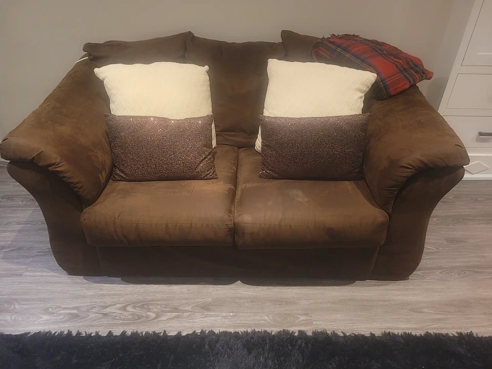Soft microfiber material, very cozy for lounging. Some light wear on the seat cushions, but overall clean and sturdy. Perfect for a small apartment, basement, guest room, or starter space. P.S. accent pillows and duvet not included.