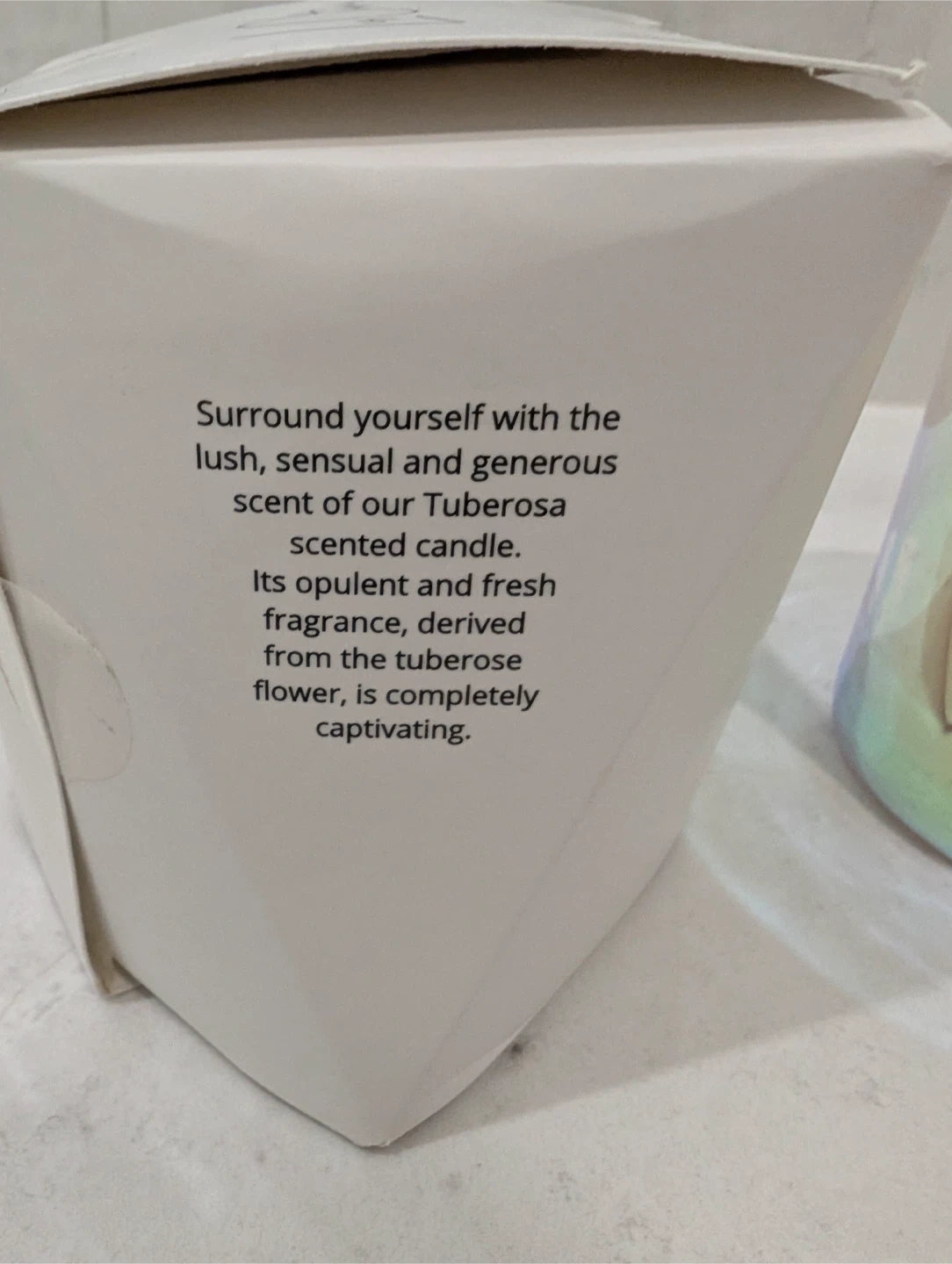 This hand-poured candle is made with a premium soy wax blend, a cotton wick, and precious fragrance oils. The burn time is 60 hours. It's made in Canada and has a lush, sensual, and generous scent of tuberosa. The candle is 240g and comes in its original box