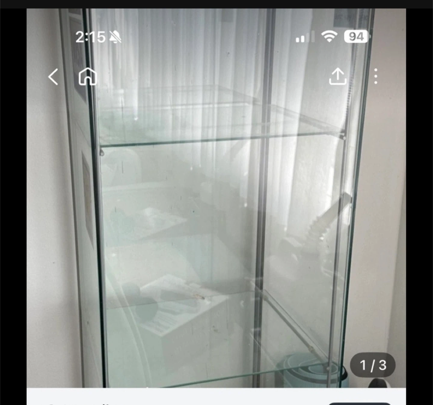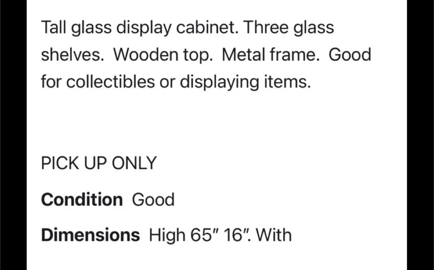 Tall glass display cabinet with three glass shelves, perfect for displaying collectibles or other items. It has a wooden top and metal frame. Dimensions are 65" high and 16" wide. In good condition