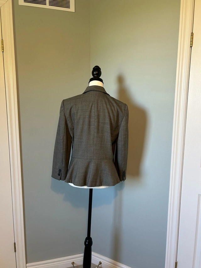 Elevate your professional wardrobe with this chic and modern Ann Taylor blazer! This jacket features a subtle, sophisticated gray pattern—likely a heather or micro-check—that makes it versatile for mixing and matching. Key Features: Brand: Ann Taylor Size: 10T (Ten Tall) - Perfect for someone who needs a little extra length in the sleeves and torso! Pit to pit: 20 inches Arm length 20 inches Length 23 inches Shoulder to shoulder 17 inches Color: Gray/Charcoal with a subtle patterned weave. Style: Peplum Hem in the back, adding a flattering, feminine detail and structure to the waistline. Closure: Three-button front. Sleeves: Features decorative four-button cuffs. Lining: Fully lined for a smooth fit. Condition: Very Good pre-owned condition. This blazer is a timeless piece that works for job interviews, the office, or even dressed down with jeans for a smart casual look. Cash accepted. Cashless payment accepted.