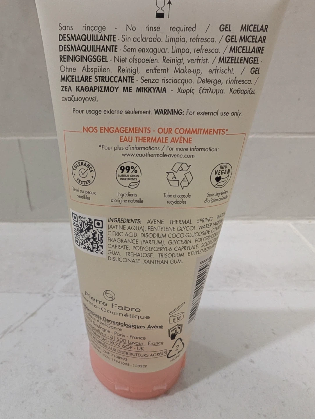 I'm selling a bottle of Avène Micellar Gel Makeup Remover! It's designed for sensitive face and eyes, and it gently cleanses and refreshes. It contains 99% natural ingredients. The bottle contains 100ml / 3.3 fl oz