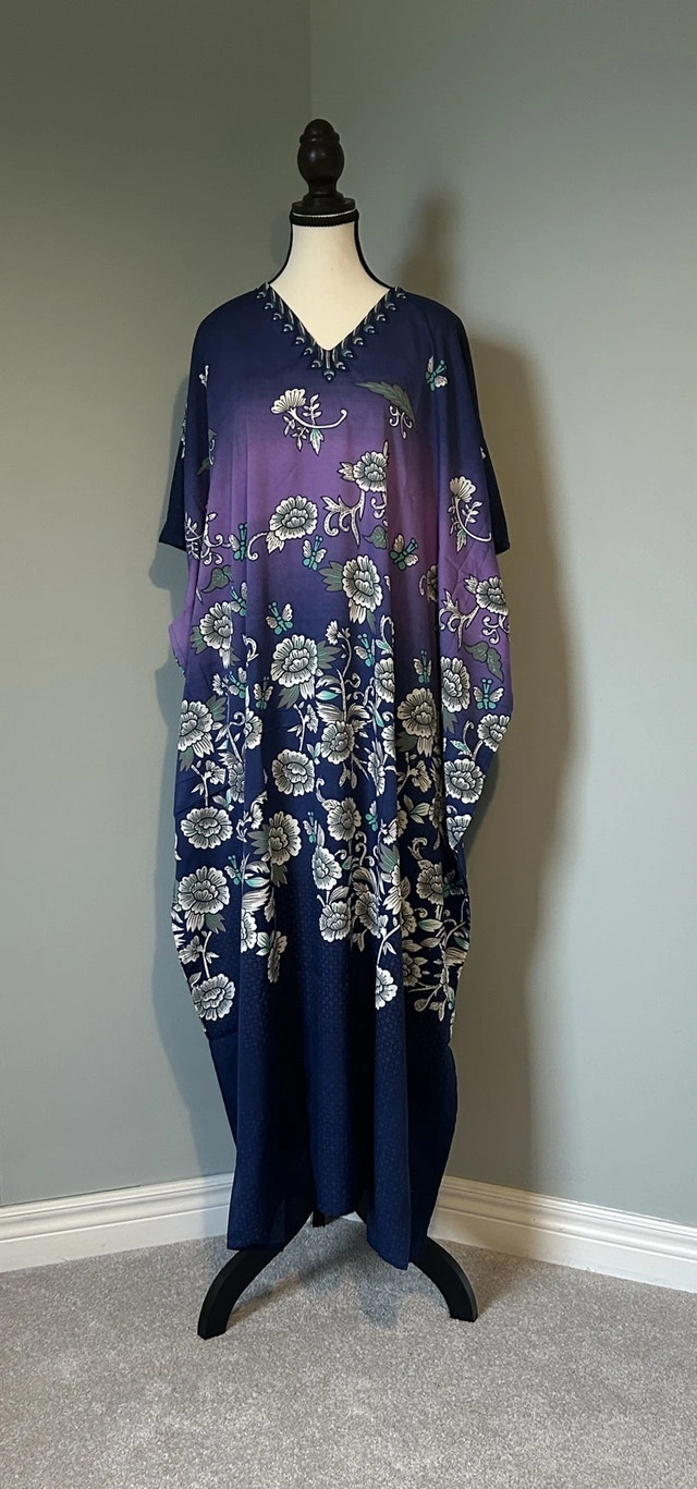 Add a touch of elegance to your wardrobe with this Miss Lavish London caftan, featuring a beautiful floral print on a flowing, comfortable fabric, perfect for lounging or special occasions. This caftan fits sizes UK 18-22, USA 14-18, EUR 46-50, and AUS 18-22 and is made of 100% polyester. This item is new with tags. Here are some more details about this lovely caftan: * **Brand**: Miss Lavish London * **Style**: K-134 * **Sizes**: Fits UK 18-22, USA 14-18, EUR 46-50, AUS 18-22 * **Colour**: Blue * **Material**: 100% Polyester * **Made In**: India