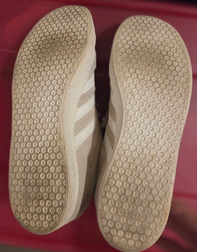 Selling a pair of Adidas Gazelle shoes in US size 7! They show some signs of wear, but still have lots of life left in them. The colour is a nice neutral grey.