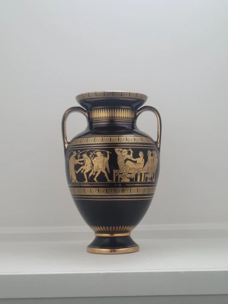 Selling a beautiful black vase with gold detailing. It has a classic amphora shape and would look great as a decorative piece in any room