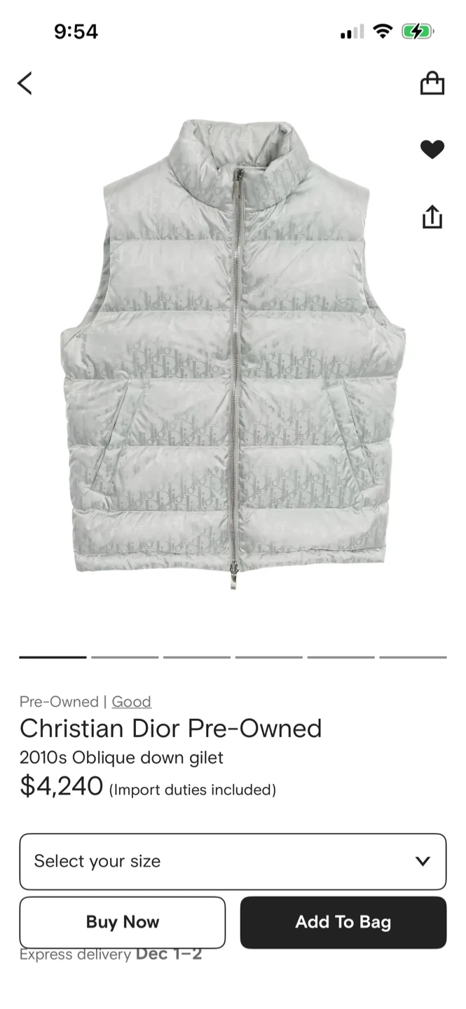 Selling a Christian Dior Oblique down gilet. It's in good condition and features the iconic Dior Oblique pattern throughout. The material is 100% cotton. The item is authentic.