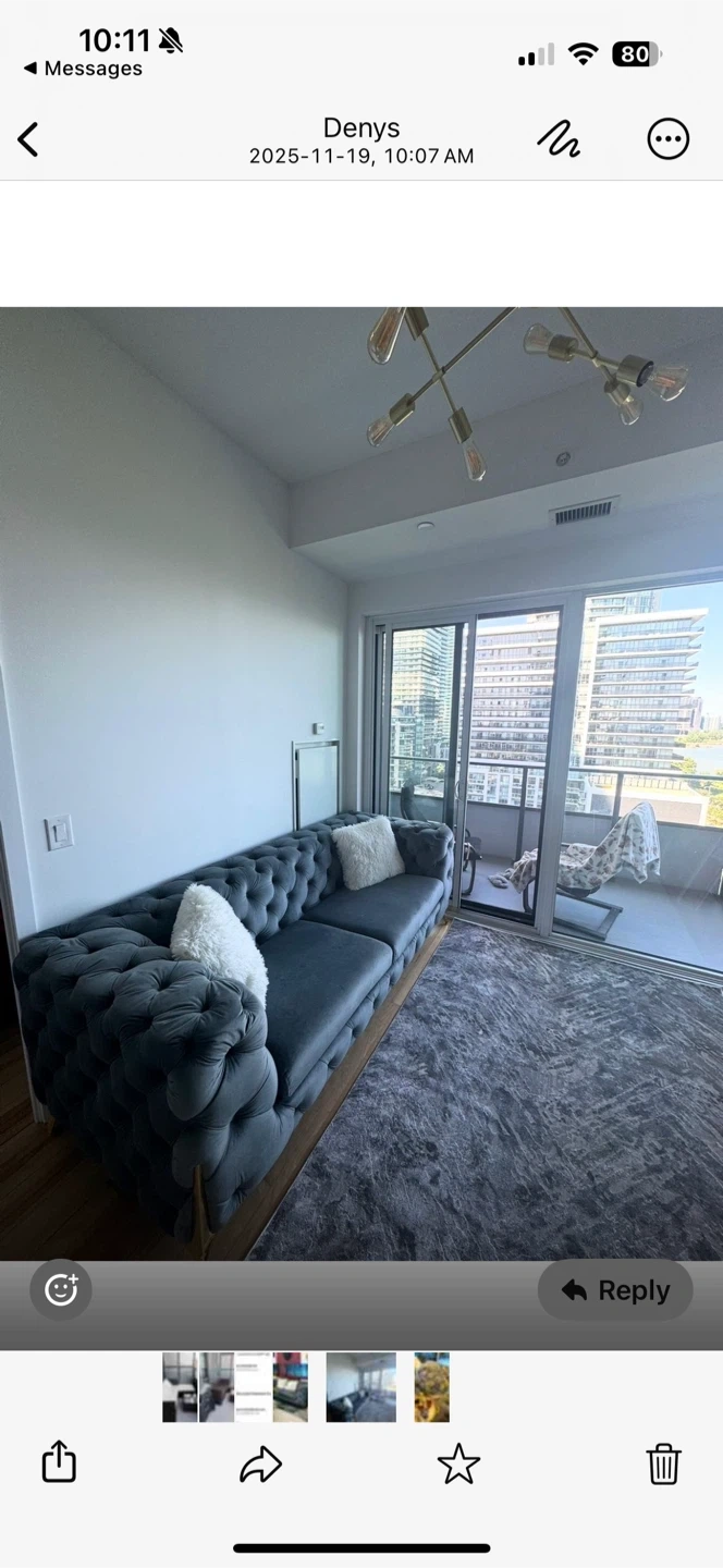 Selling a lovely blue tufted sofa that measures 89x36. It's in great condition and would look fantastic in any living room!