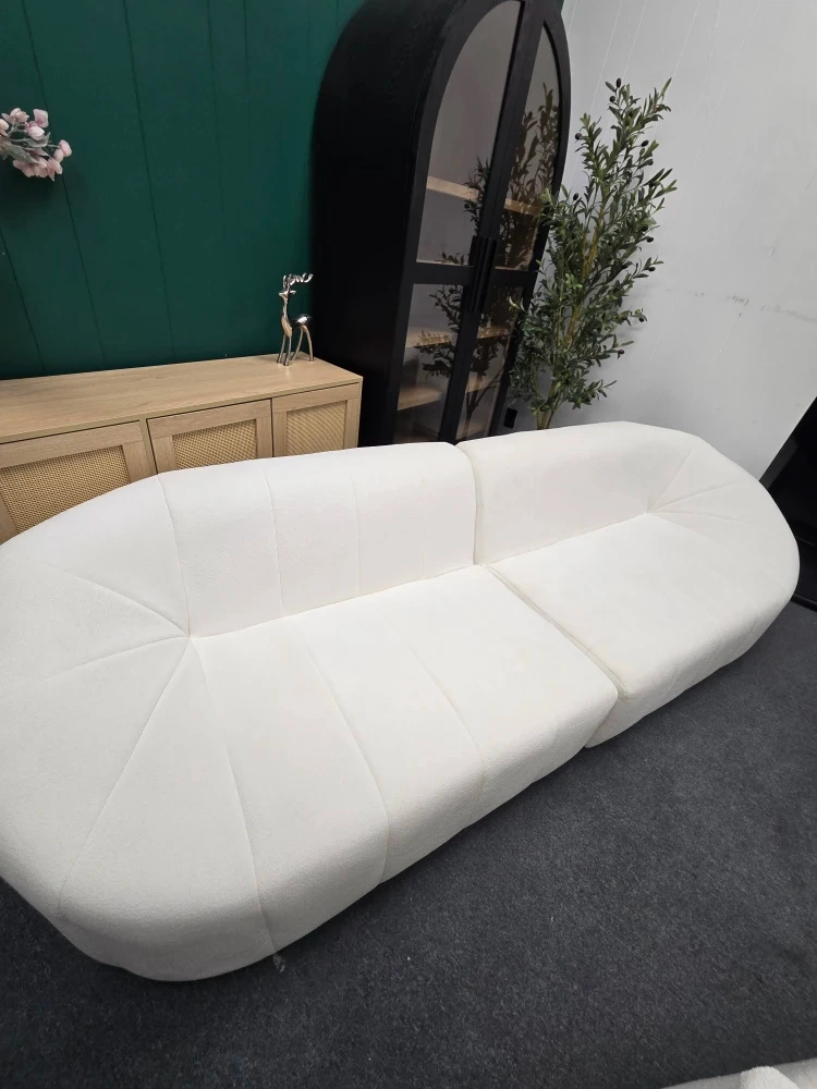 Selling a stylish sofa with a unique design! It features a soft, white boucle fabric that adds a touch of elegance to any living space. This sofa is perfect for lounging and relaxing after a long day. It's in great shape and ready for a new home!