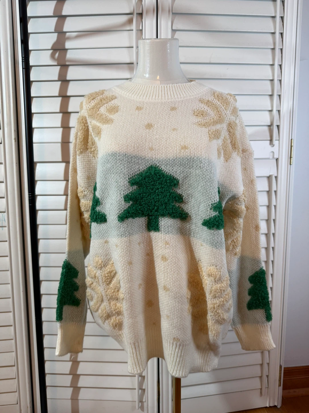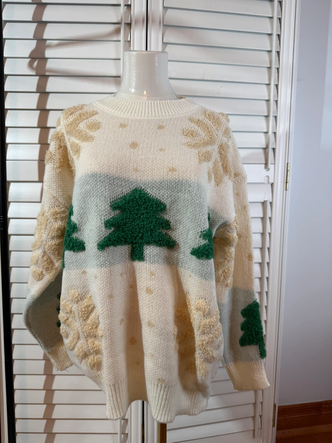Cozy up this winter with this adorable Christmas tree sweater! It features a cream base with green Christmas tree appliques and a unique textured design. Perfect for the holiday season!