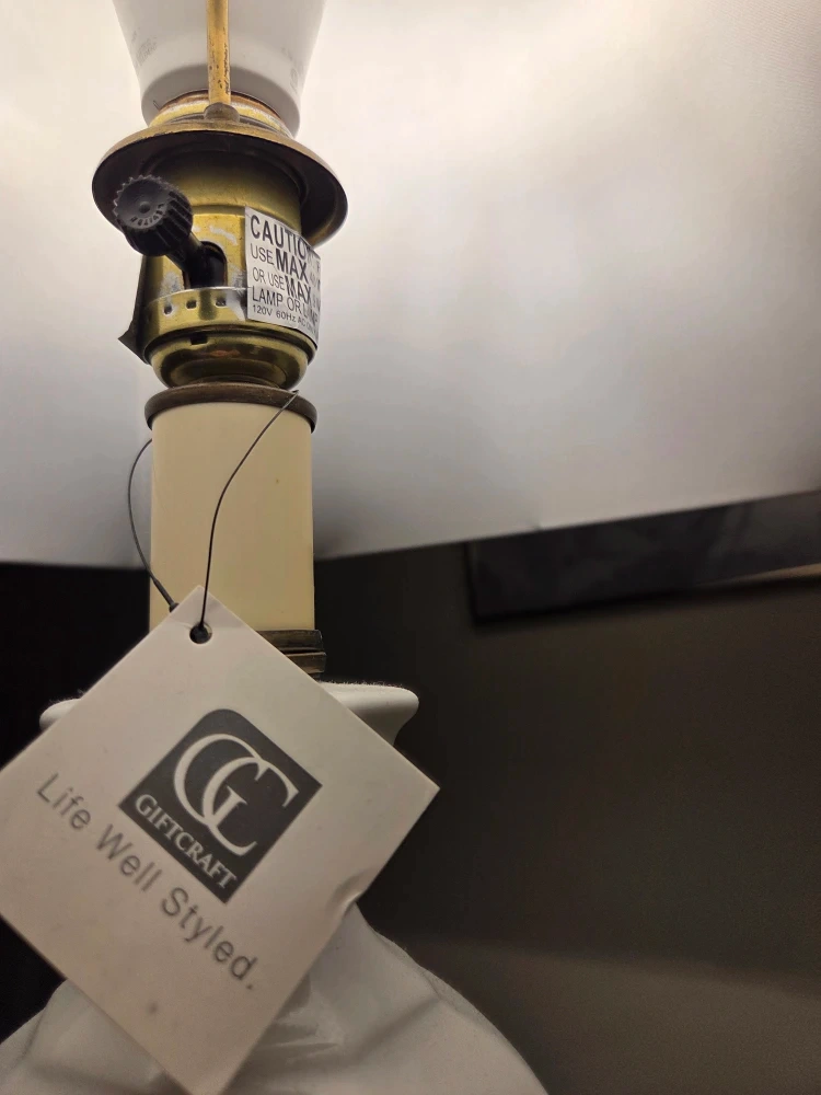 Two bedside table lamps, in white ceramic with two on/off switches, lampshades in perfect condition, bulbs included.