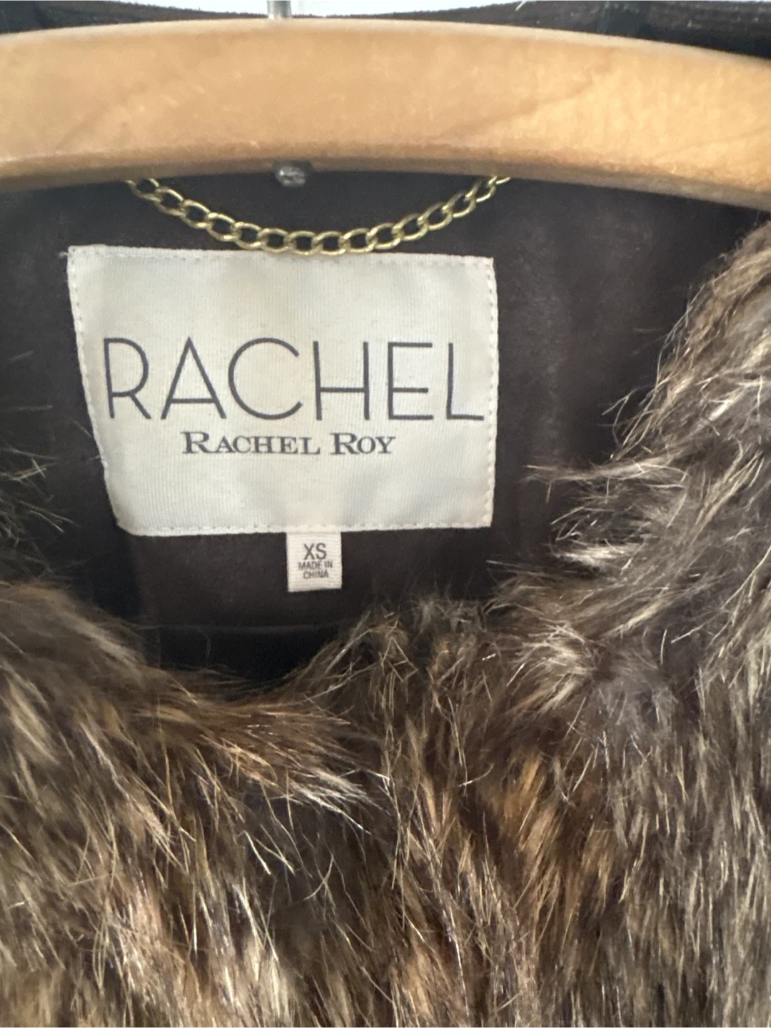 Rachel Roy faux fur vest in size XS! It's a stylish piece with a brown faux leather back and faux fur on the front and sides. The lining is 100% polyester, and the faux fur is a blend of acrylic and modacrylic.