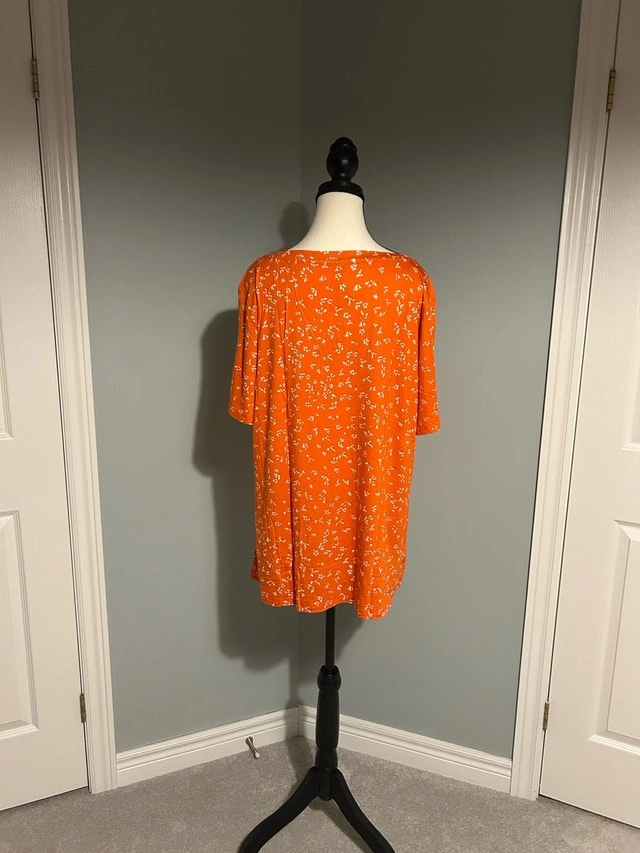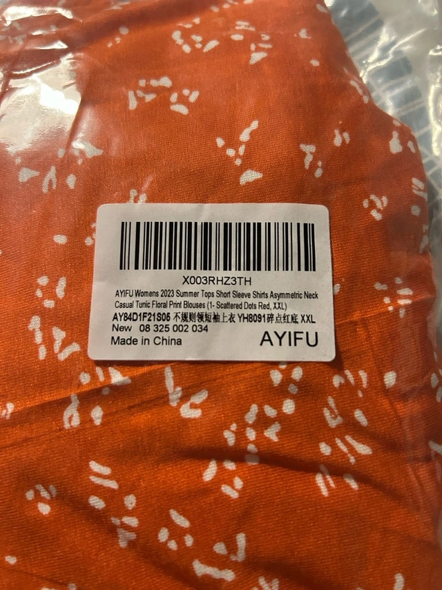 Spruce up your wardrobe with this brand new AYIFU women's 2023 summer top, a charming tunic with short sleeves and an asymmetric neckline, adorned with a delightful scattered floral print in red on a vibrant orange background, perfect for a casual yet stylish look. This blouse is made with 95% rayon and 5% spandex. Specifications: * Size: XXL * Colour: Orange/Red * Material: 95% Rayon, 5% Spandex