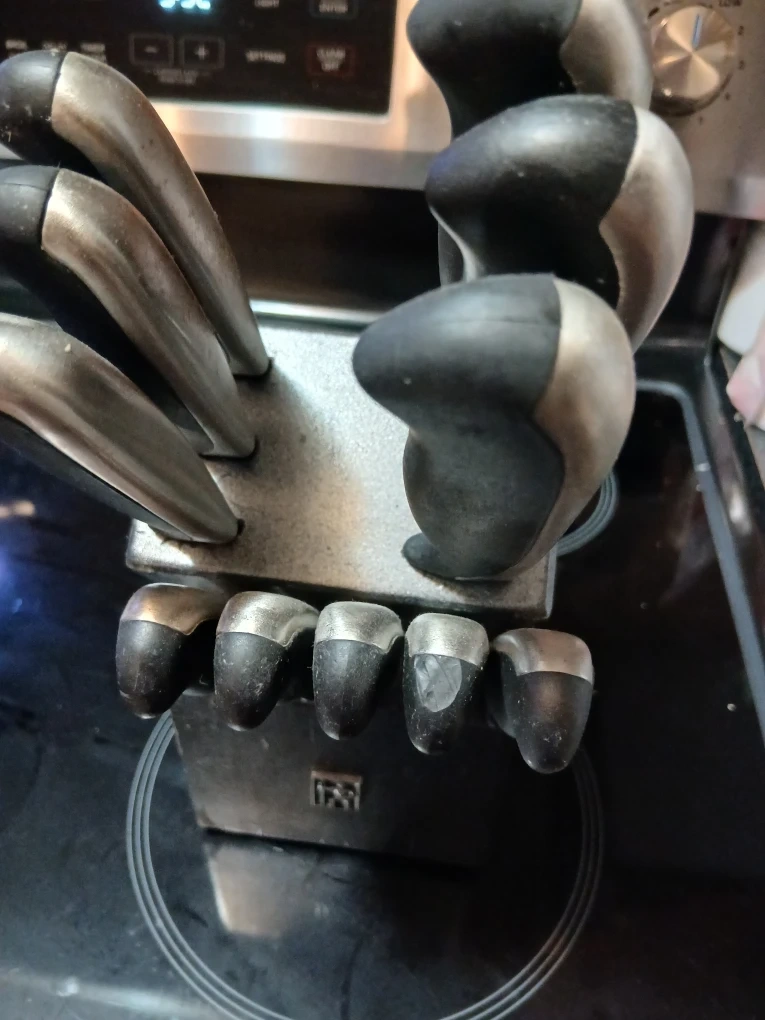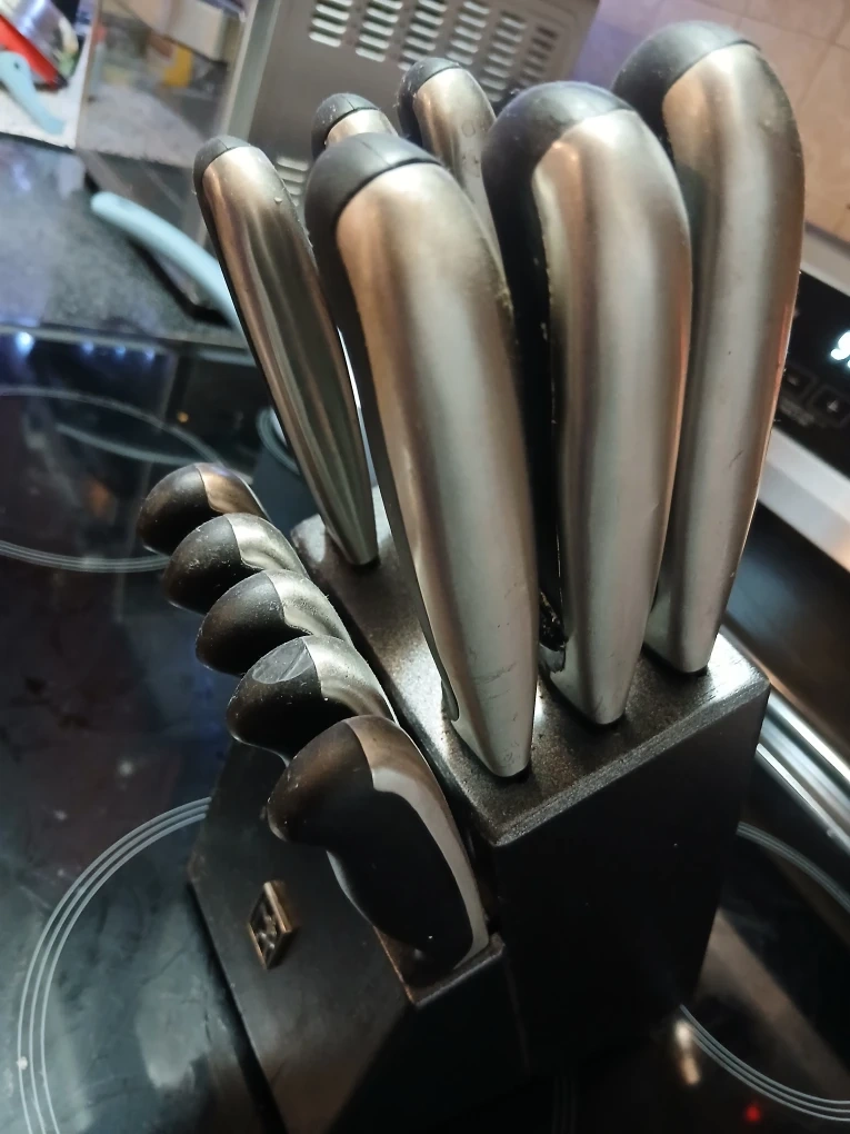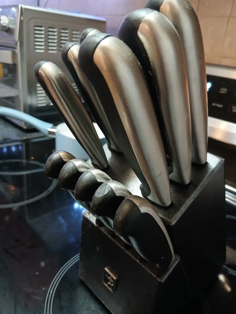 Selling a Zwilling J.A. Henckels knife set. It comes with the block, as pictured. The knives are in used condition, showing some signs of wear. 11 knives and block