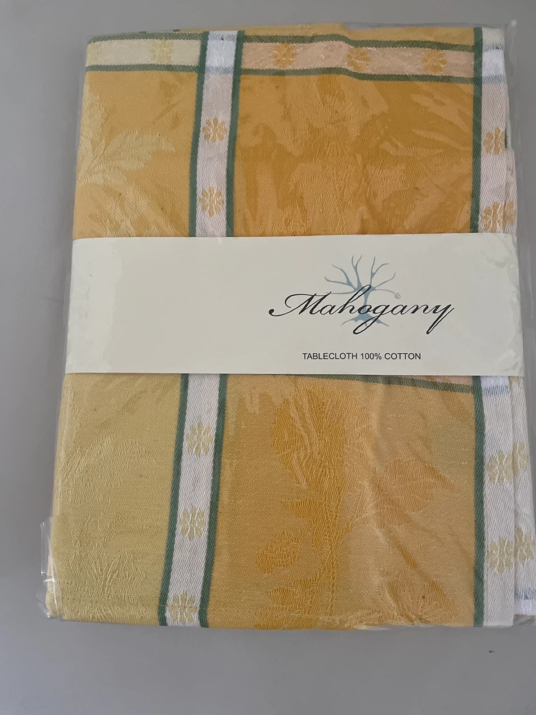 This is a brand new Mahogany tablecloth, still in its original packaging! It's 36" x 36" and made of 100% cotton. The colours are a lovely yellow, white, and green.
