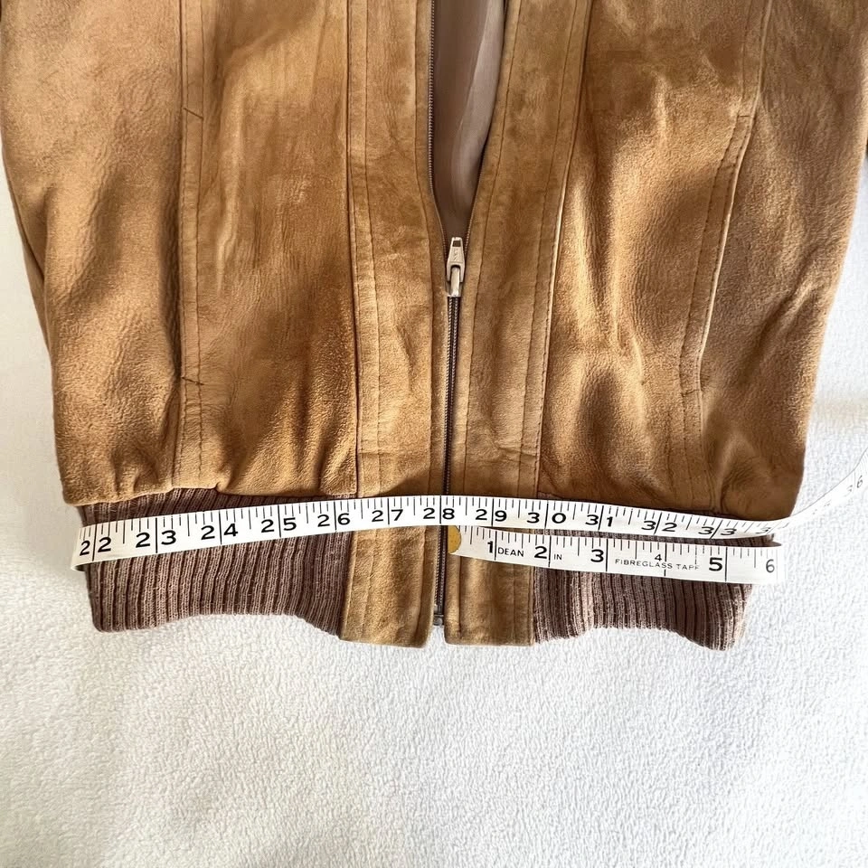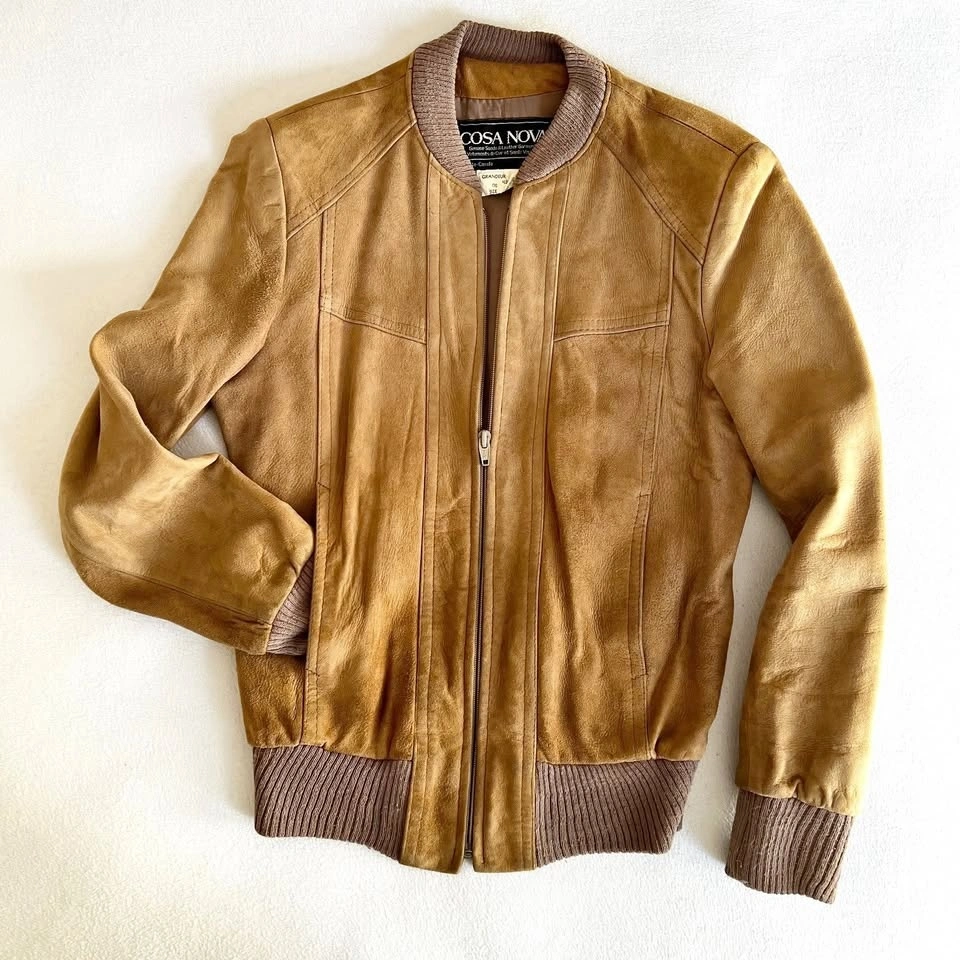 Vintage 90s Cosa Nova beige suede jacket in excellent condition. Genuine suede leather. Waist length with pockets. Fits 28" waist, inside length of sleeve is 16" inches.