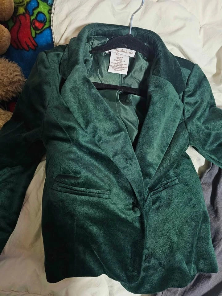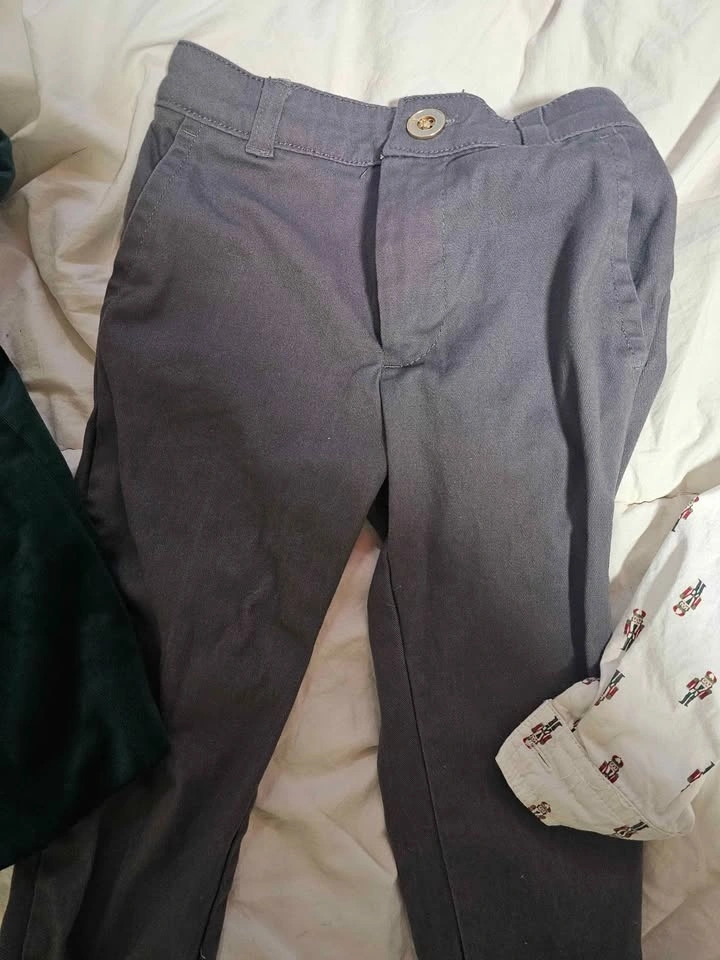 Tags removed and washed - didnt fit my kid. Dark green suede tux jacket, Nutcracker long sleeve with plaid tie, and Grey pants. The outfit fits 2T/3T. Pickup pondmills