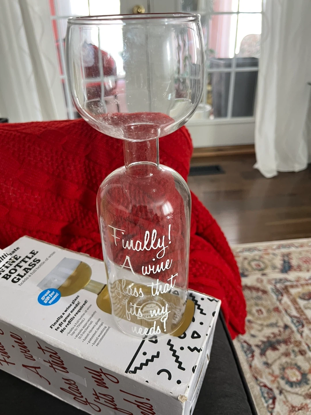 Selling a BigMouth Inc. wine bottle glass! It's the ultimate wine glass that holds a full bottle of wine. The box says it stands approximately 11.5 inches tall, and hand-washing is recommended. "Finally! A wine glass that fits my needs!"brand new, box has some damage
