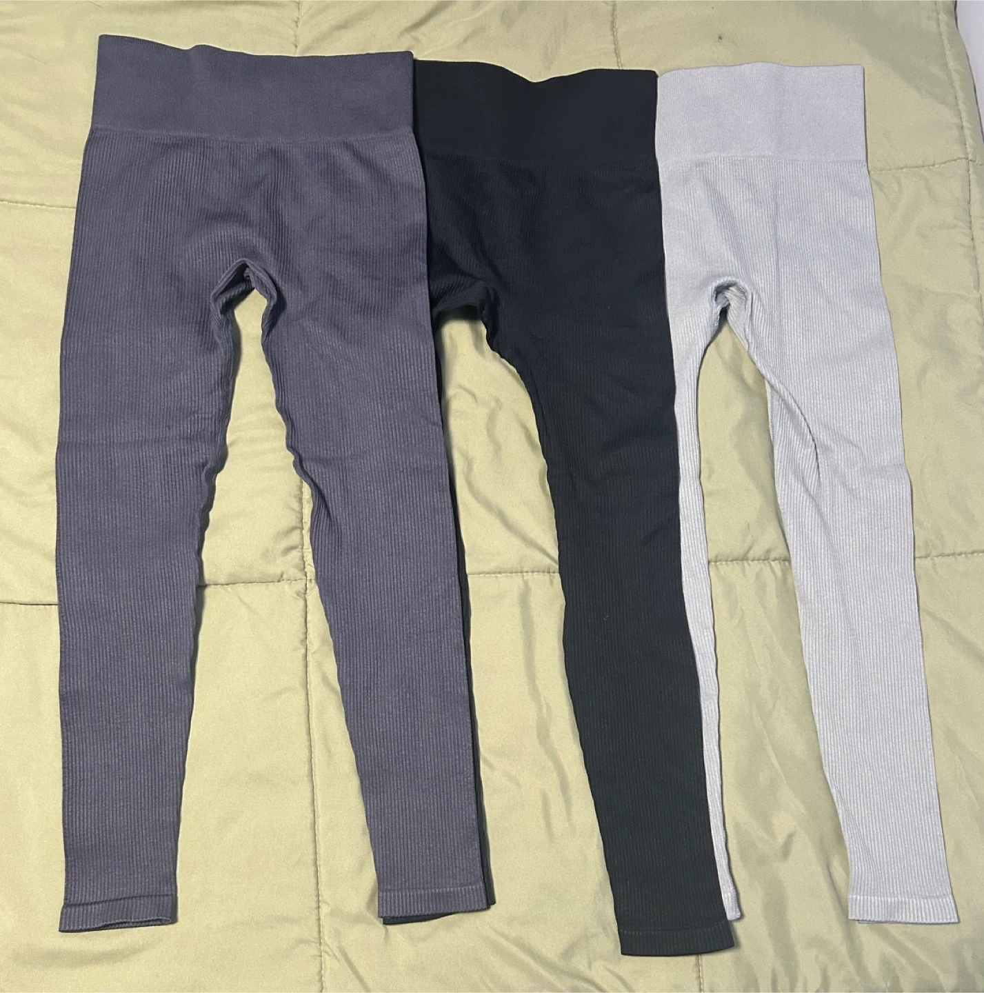 Selling a set of ribbed seamless leggings! These are great for lounging or working out. The set includes three colours: grey, dark grey, and black. They are in great condition and ready for a new owner!