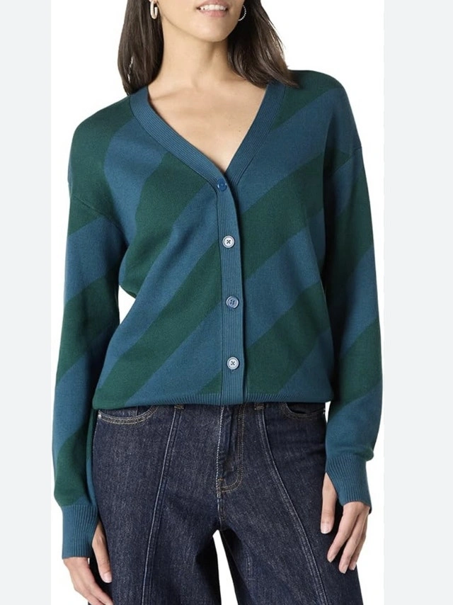 Made of a soft medium-weight, stretch, elastane sweater knit. Top length is 26”, sleeve length is 22”, bust: 42”, waist: 36”. Equivalent to a size US 16. Loose-fit, designed for comfort with sleeve thumbholes, a deep V-neck, and blouson sleeves. Stylish blue cardigan with striped pattern. Features a button-up front and V-neck design.