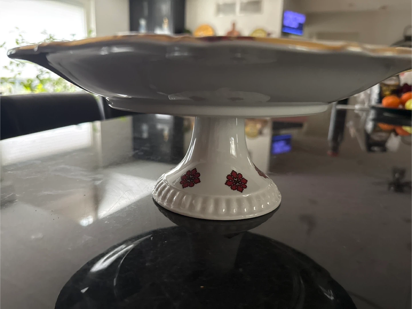 Selling a vintage pedestal cake plate. It features a white base with red floral designs and a gold trim. It would make a lovely addition to any kitchen or dining room!