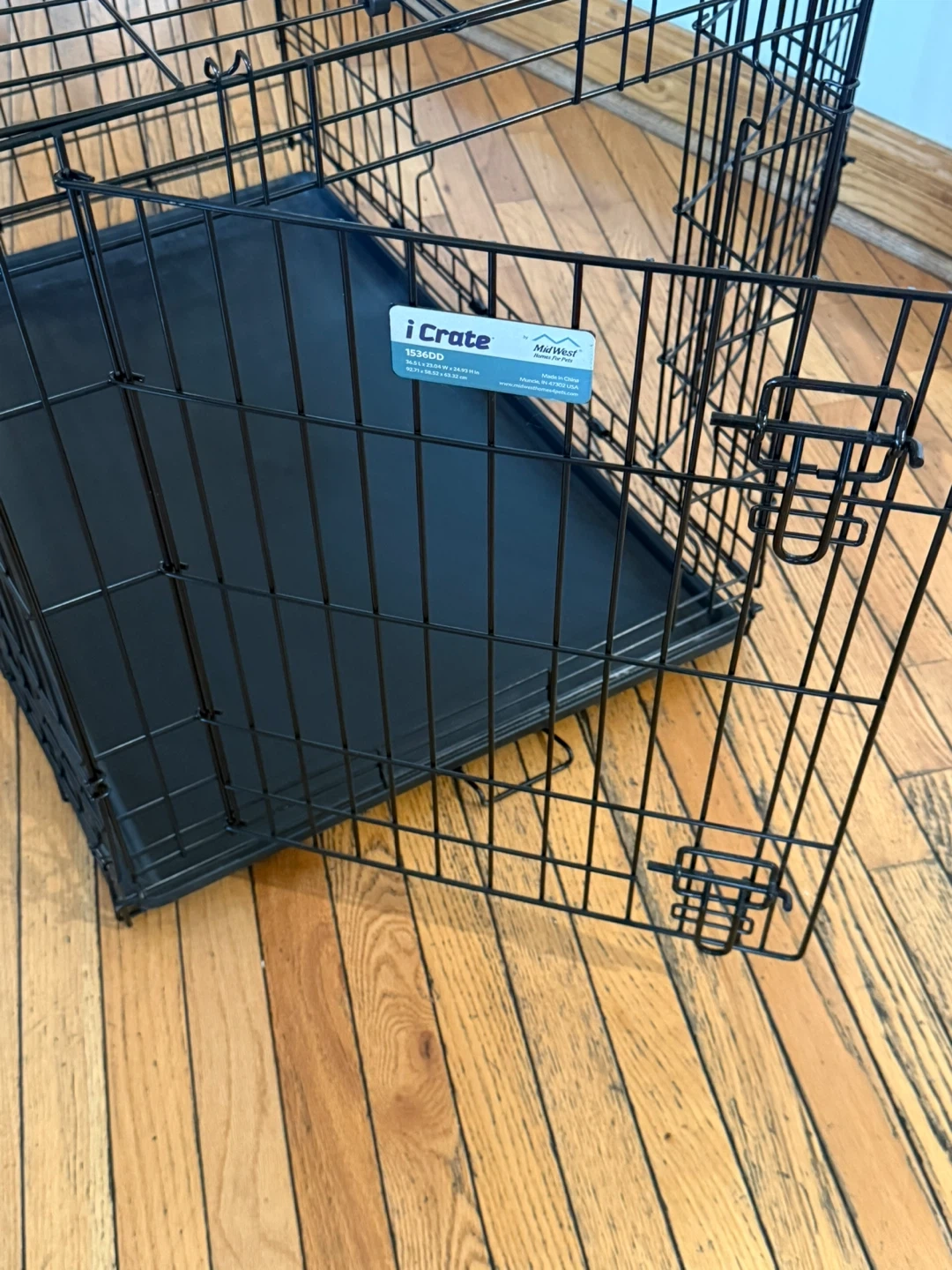 This large MidWest iCrate 1536DD is in excellent condition. Perfect for dogs that need a safe, comfortable, and secure space. Folds flat for easy storage and transport. Features • 36”L x 23”W x 25”H (fits medium–large dogs) • Two doors (front + side) for easy access • Durable black metal frame • Removable leak-proof plastic tray • Secure slide-bolt latches • Folds flat with built-in carrying handle • No rust, no damage Gently used and well maintained. Clean and ready for use.