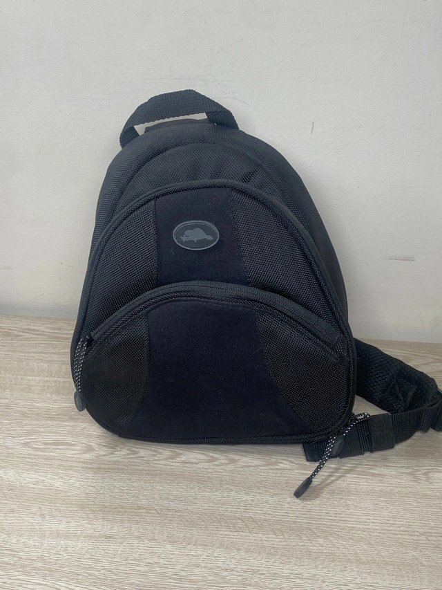 Airdrie, Morningside pickup. "Roots" sling bag. 9" x 9" x 4". Slight triangular shape. Used and in excellent condition. Front pocket. Interior has multiple pockets. Slightly insulated. DTB1-DT019