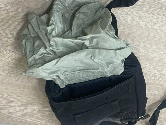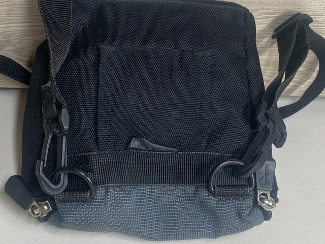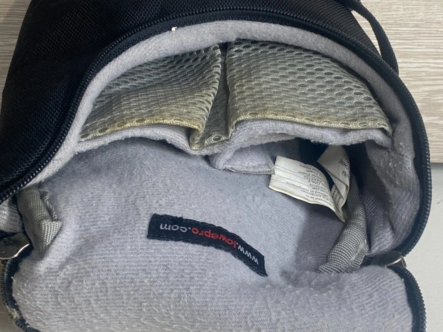 Airdrie, Morningside pickup. Product is as described or money back. Used and in very good condition. No model or name for this. Some piling on the inside liner. Multi sections. Has a rain coat/shroud. Belt loop. Shoulder strap. Size: 7" x 7" x 3"