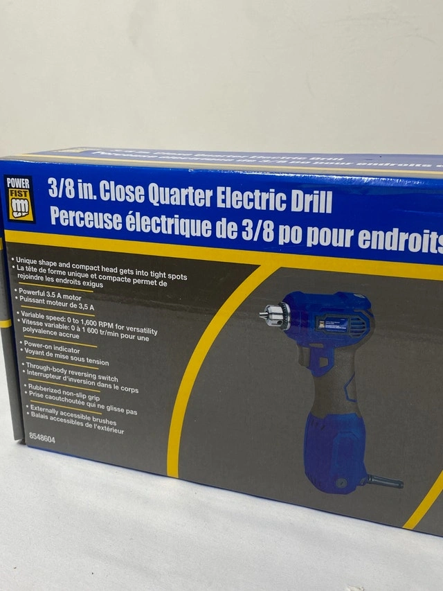Sealed 3/8" Power Fist close quarter electric drill. Unique shape combined with compact head makes it ideal for accessing tight, confined spaces. 3.5A motor, variable-speed control, lock-on button for extended use and a rubberized non-slip grip. Regular Princess Auto Price: $70. Airdrie, Morningside pickup.