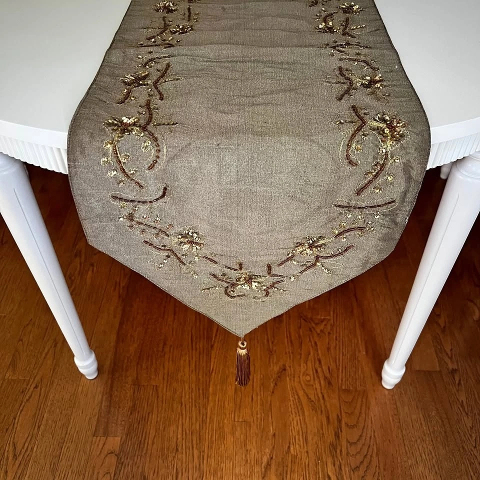 New fall table runner with bling and tassels. Beautiful embroidery, beads and sequins add sparkle to this table runner. Khaki/Light Taupe colour. Measures: 13'' x 72". Made by Accents de Ville; 100% polyester