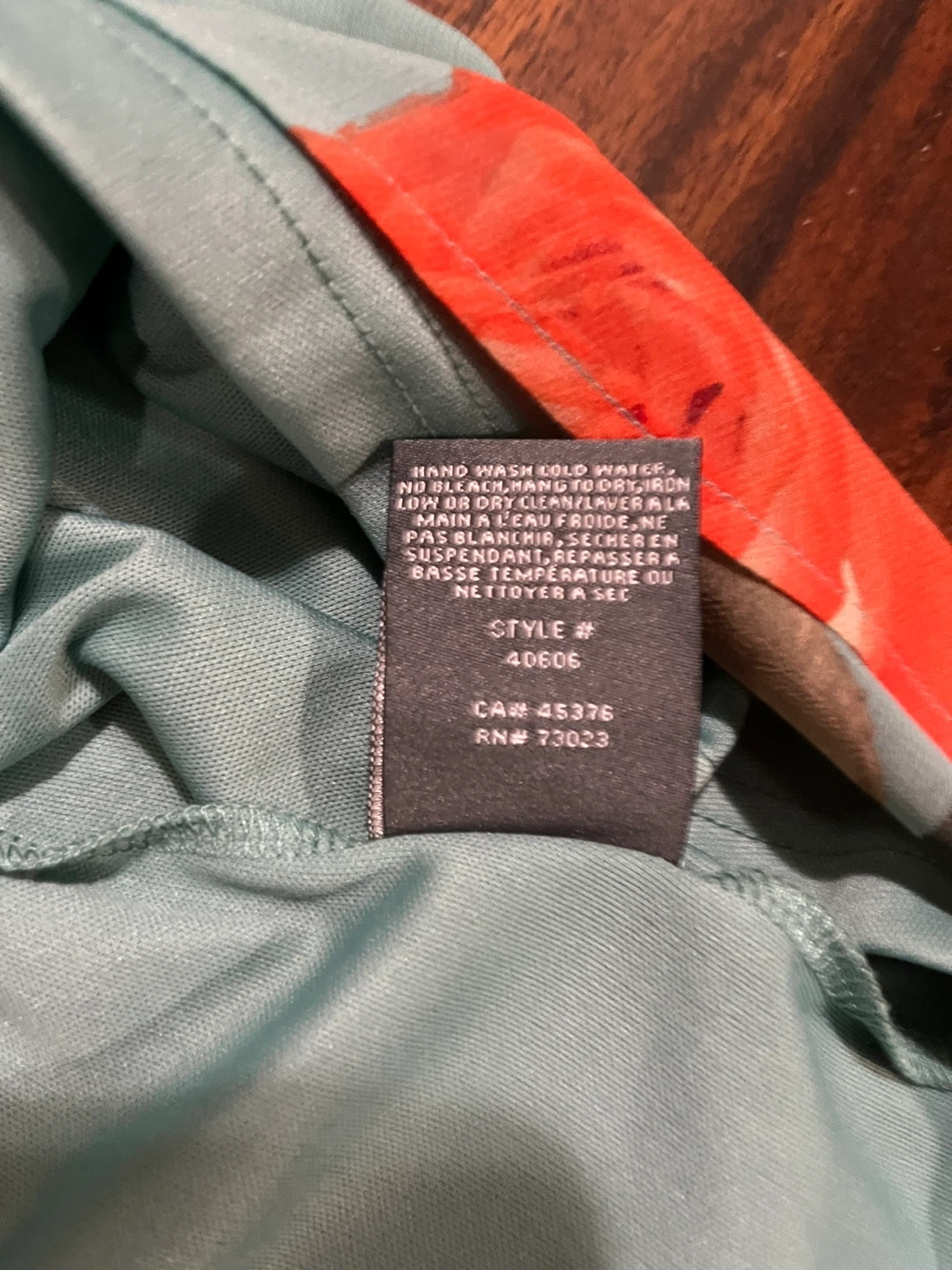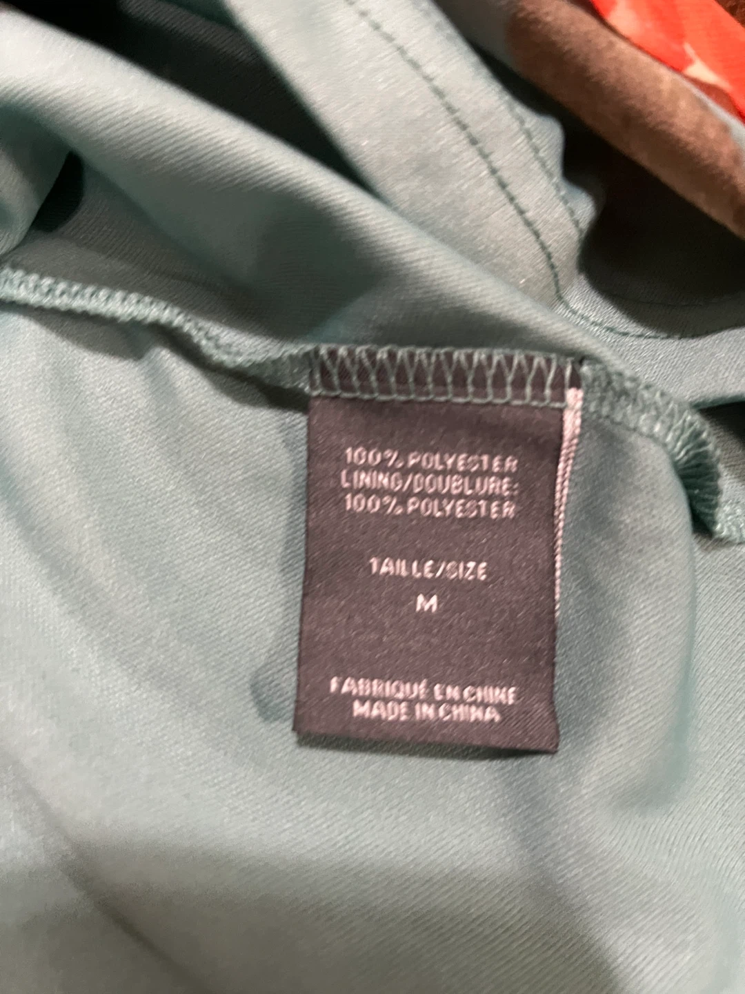 Suzy Shier sleeveless dress in women’s medium. Teal with bold orange and peach floral print. Lightweight and breathable with a semi-sheer overlay and full lining. Button closure at the back of the neck.