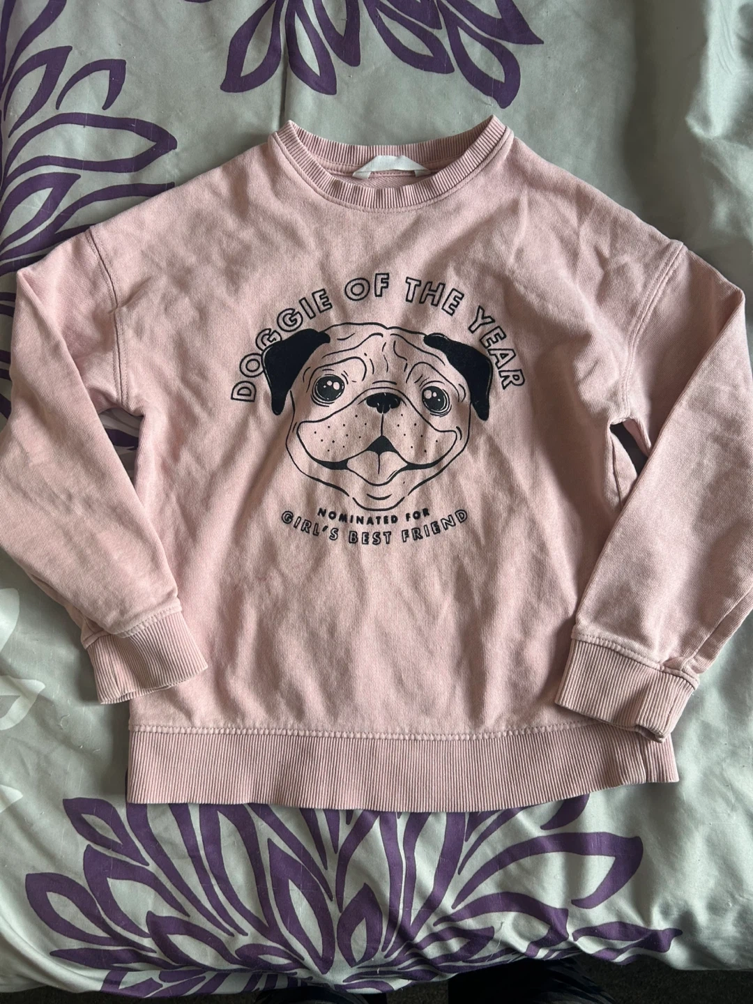 I'm selling a cute MNG Kids sweatshirt in a lovely pink colour! It features an adorable "Doggie of the Year" graphic, making it a fun and stylish choice for your little one. The size is 8. Small marker stain on it.