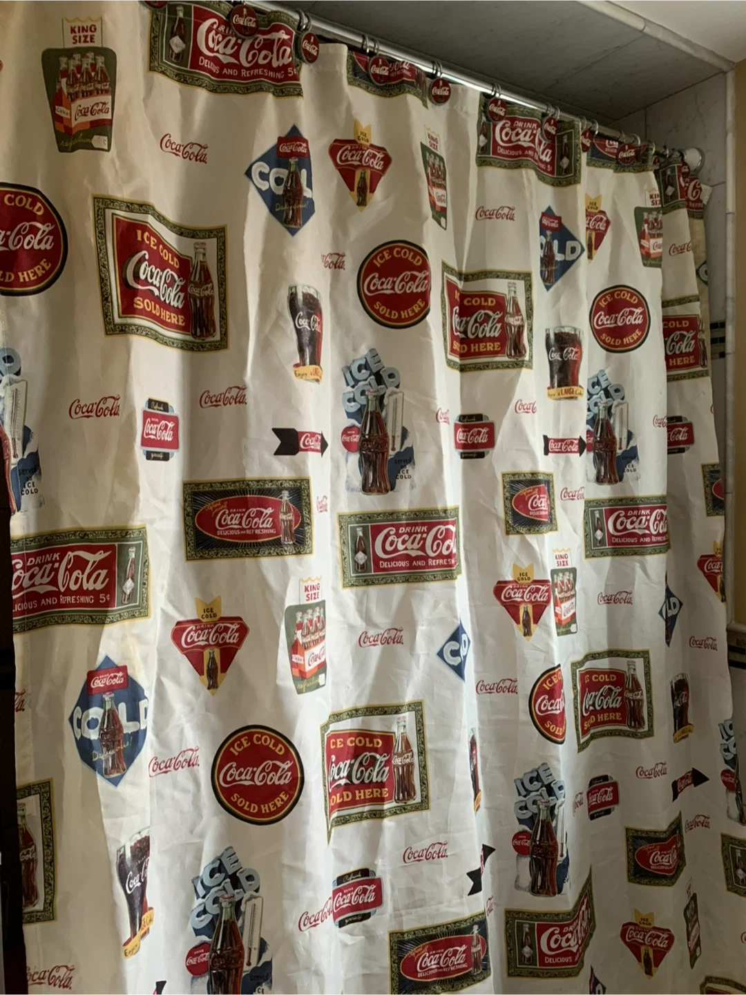 Spruce up your bathroom with this unique Coca-Cola shower curtain! It comes with matching shower hooks, all featuring classic Coca-Cola designs. Perfect for adding a touch of vintage charm to your Coca Cola space.