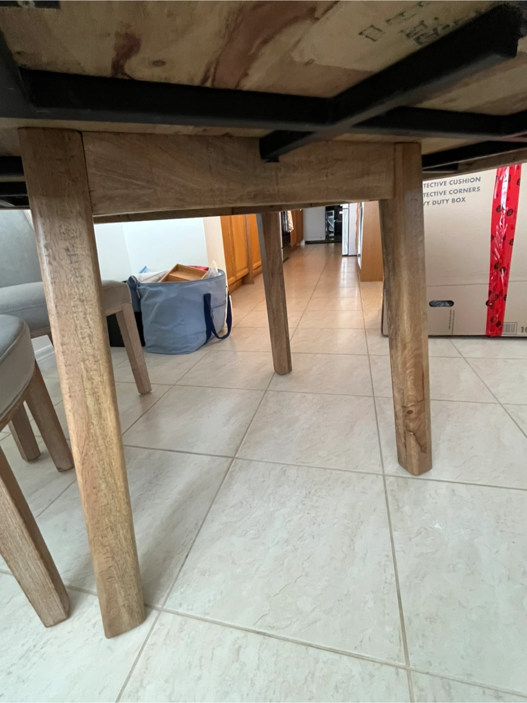 Selling a round distressed mando wooden dining table. It's brand new condition and would be a great addition to any dining room or kitchen! The table has a unique wooden pattern on top and sturdy wooden legs.