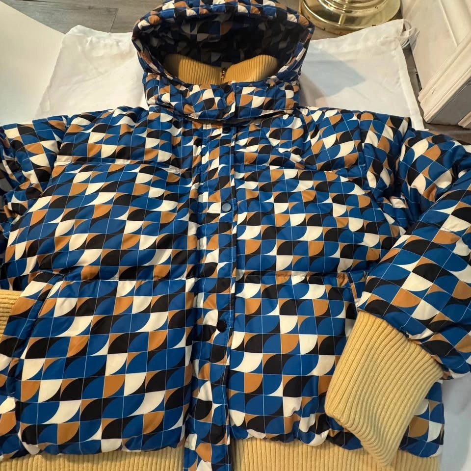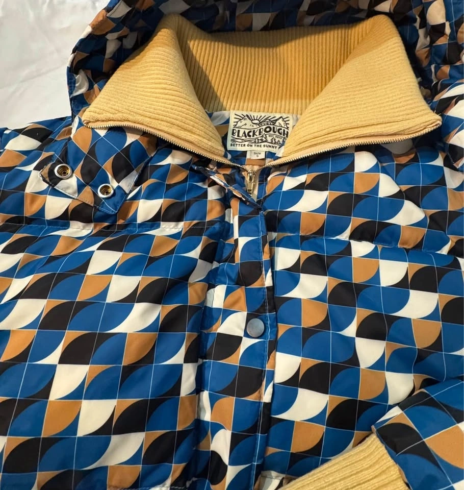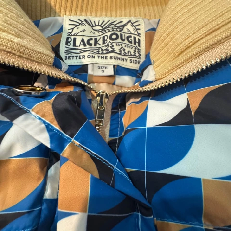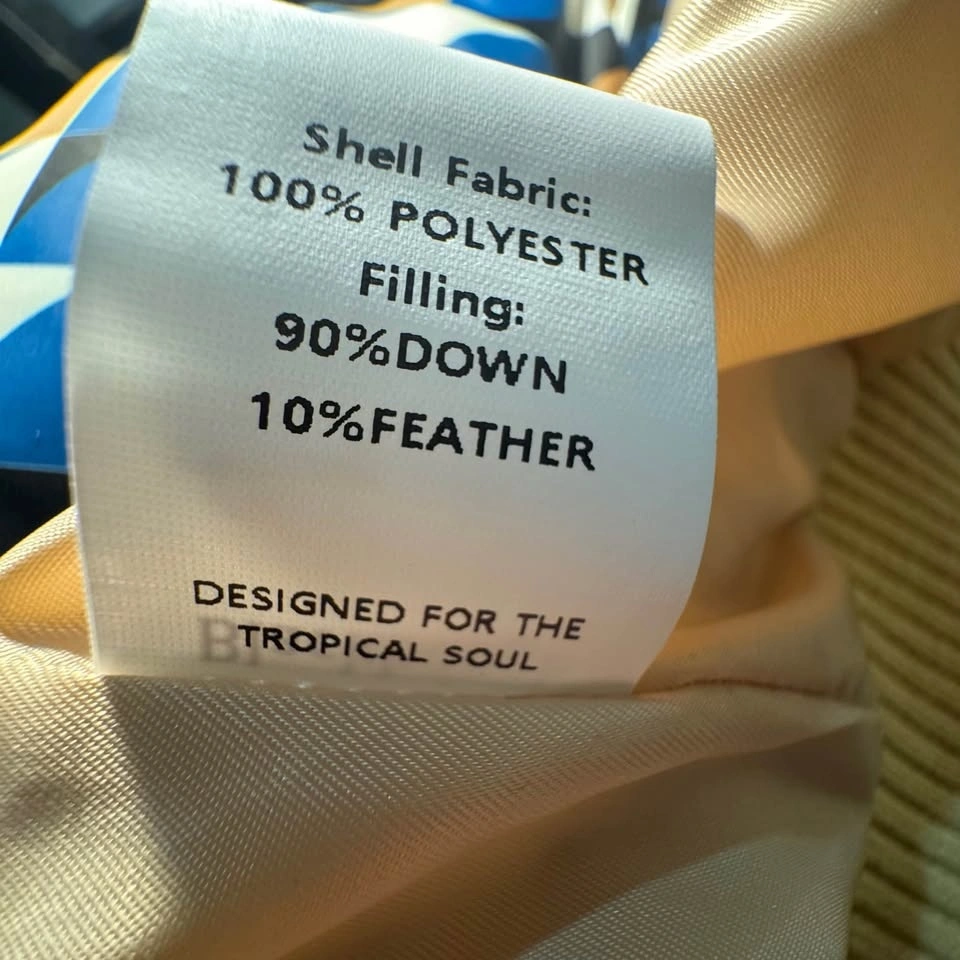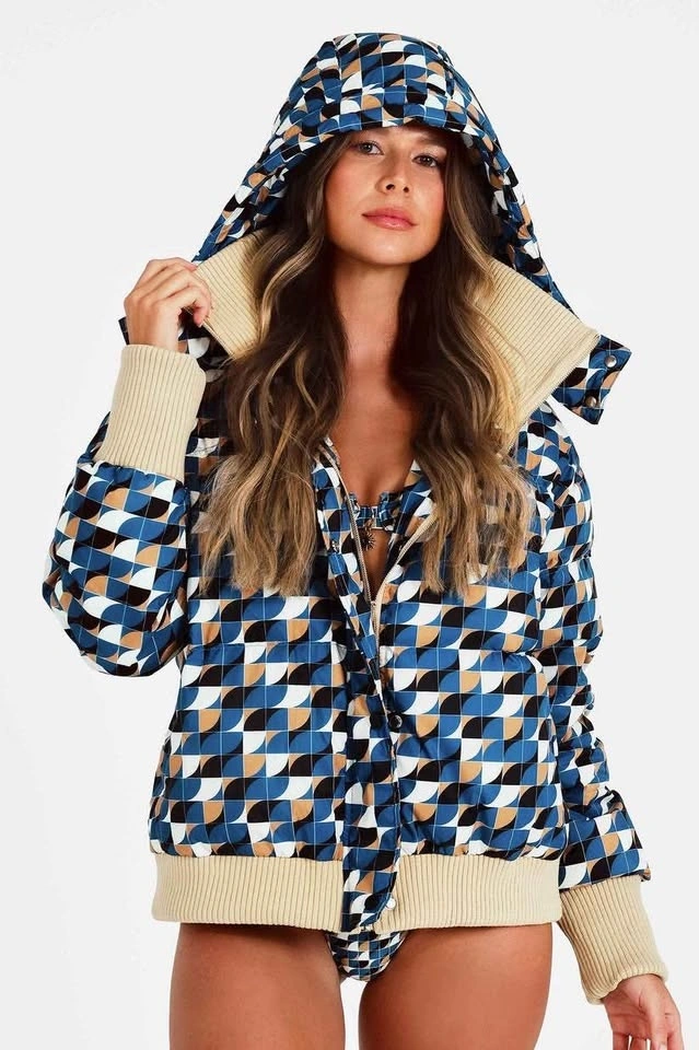 Details 100% Polyester Filling: 90% Down / 10% Feather Has a removable hood Features snap buttons Features ribbed knit cuffs, collar, and hem Print designed exclusively for Blackbough Swim.