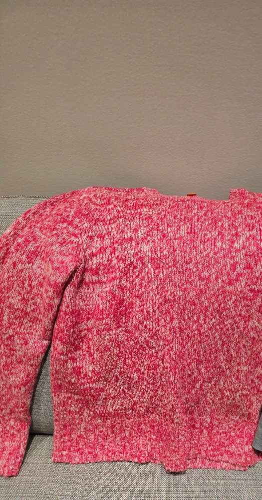 Here's a cozy pink knit sweater! It's a lovely colour and perfect for layering on cooler days. The material feels soft and comfortable. It's in great condition and ready for a new owner!
