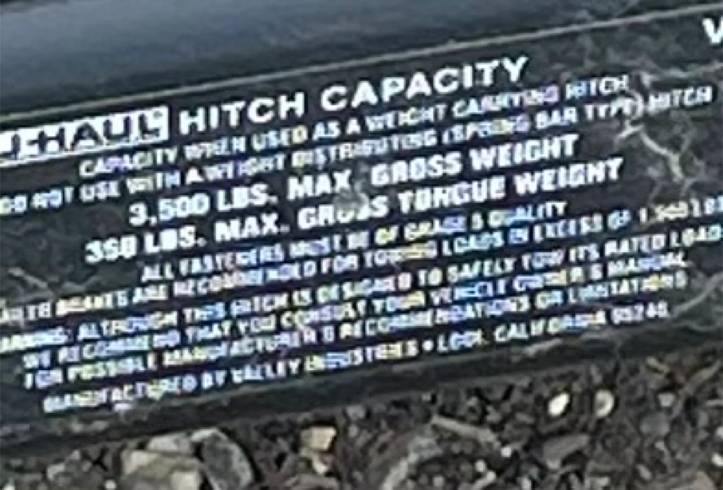 Selling a U-Haul hitch receiver. It has a capacity of 3,500 lbs max gross weight and 350 lbs max tongue weight. Please consult your vehicle owner's manual for possible manufacturer recommendations or limitations