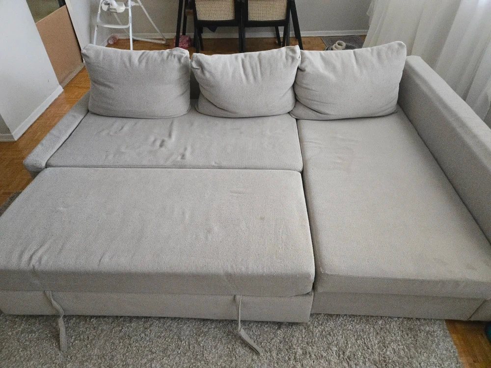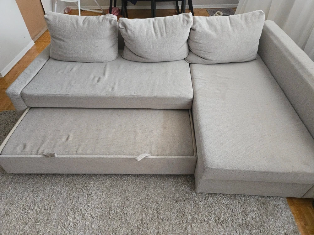 Selling an IKEA Friheten sectional sofa with a pull-out bed. It's in great condition and perfect for a living room or spare room. The sofa is a light grey colour, haf few coffee stains unfortunately but offers comfortable seating and a convenient sleeping solution for guests. It's a great space-saving option!
