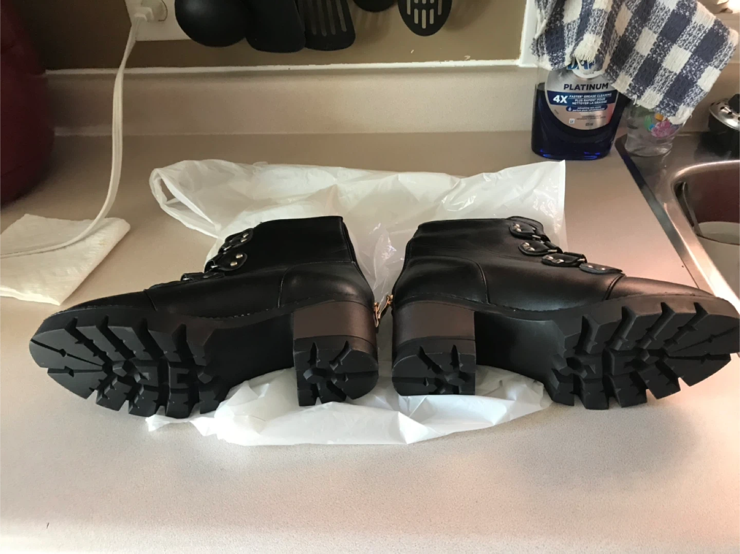 Selling a pair of black ankle boots. They feature a chunky heel and buckle detailing, giving them a bit of an edgy look. The boots have a zipper in the back for easy on and off. They're in good condition, ready for a new owner!